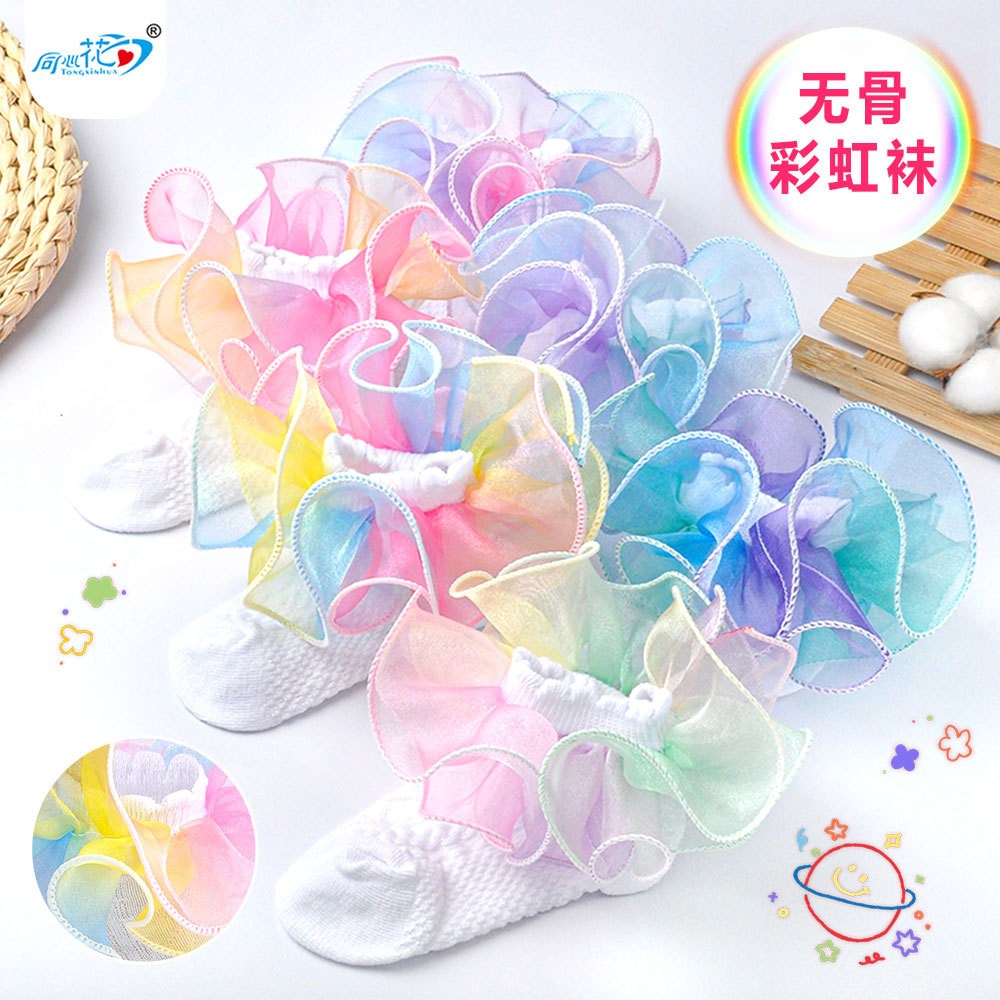 新しい女の子の靴下の虹のグラデーションの子供の靴下のレースの短い筒の靴下の通気性の赤ちゃんの靴下の現物