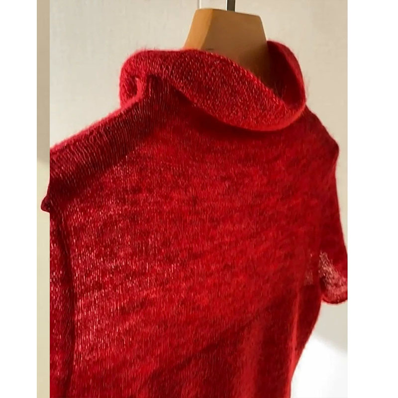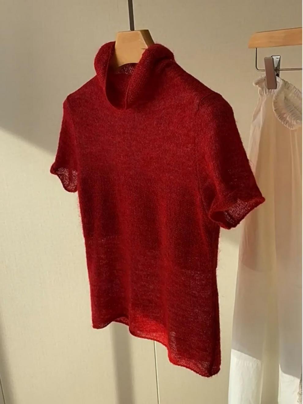ヨーロッパの人気の赤いニットセーター2023デザインパフスリーブ小さなラペル超半袖トップショートスタイル