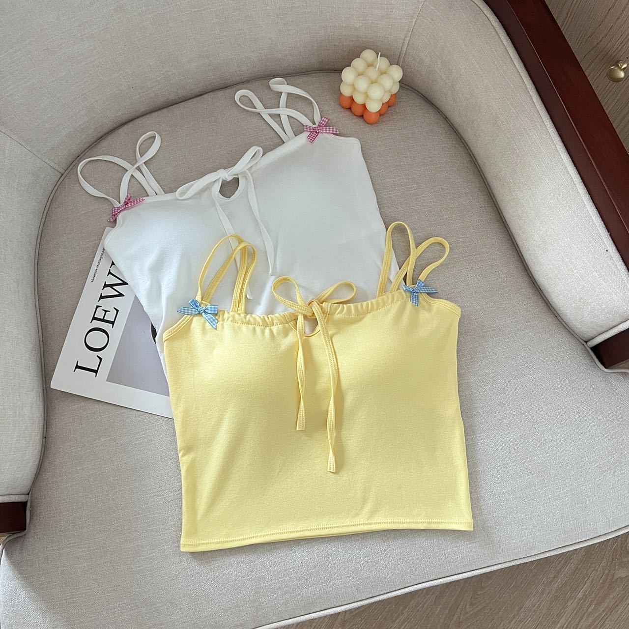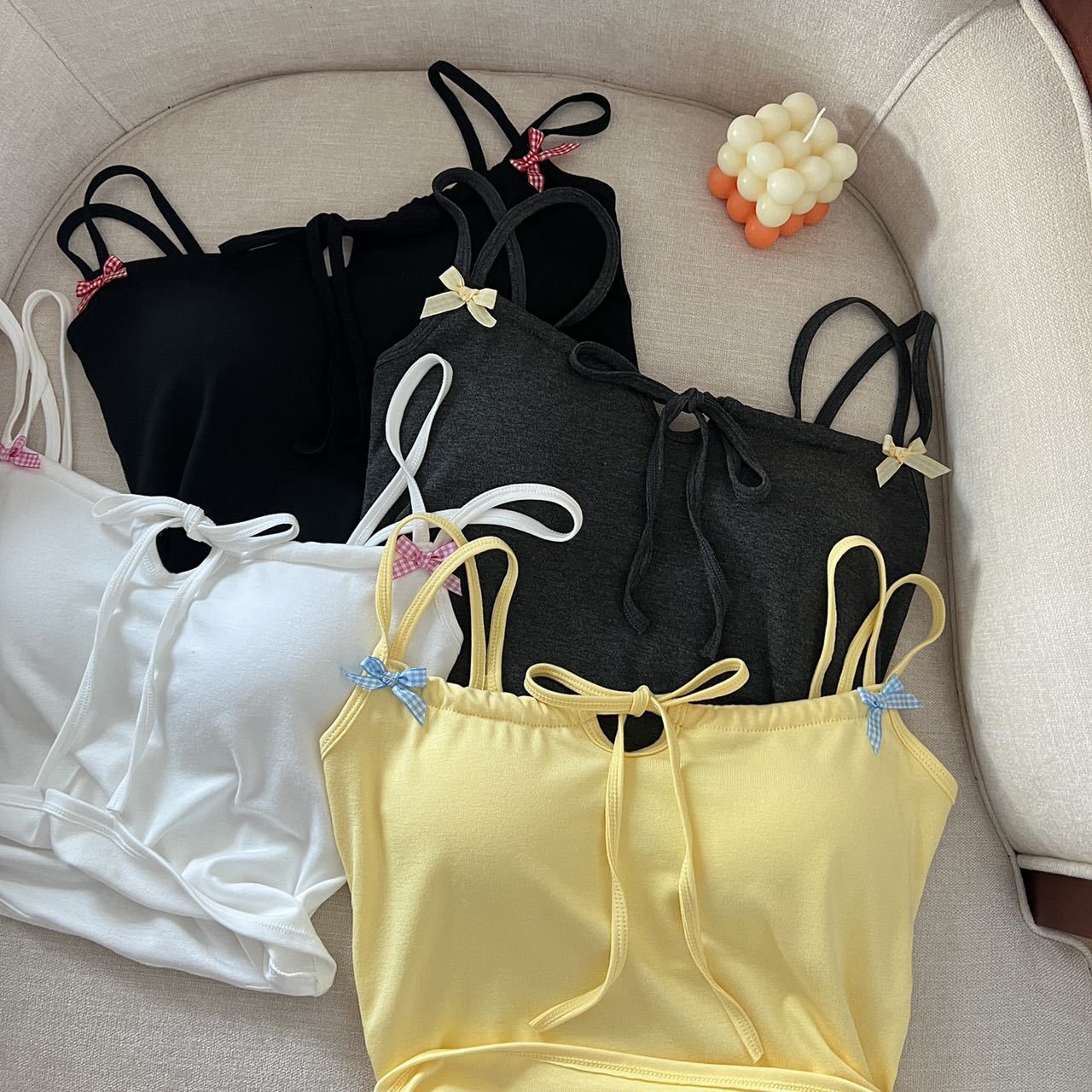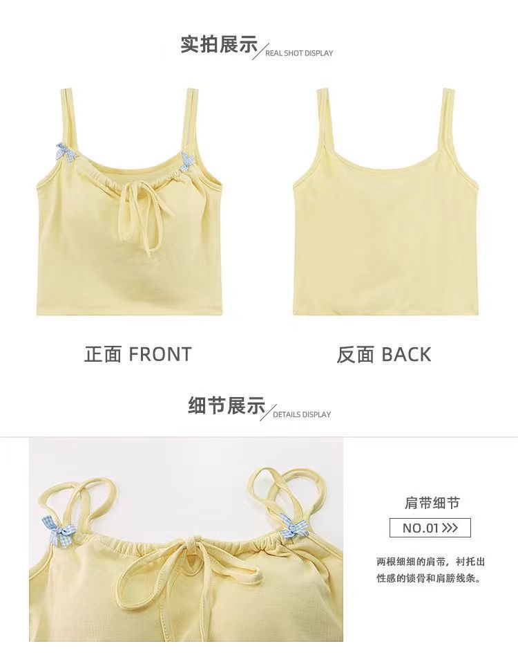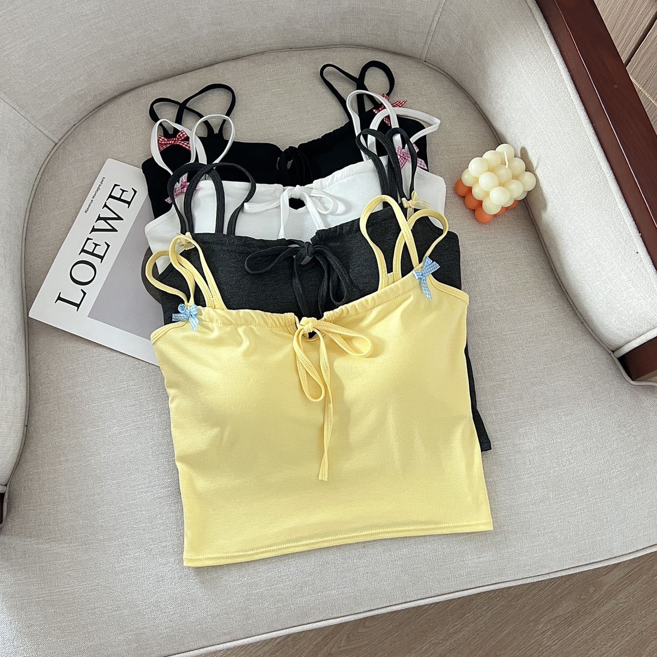 夏の清新なミルクの黄色の蝶結びのベストの女性の新型の甘い修身の短いタイプは胸のパッドの底の上着を持ちます。