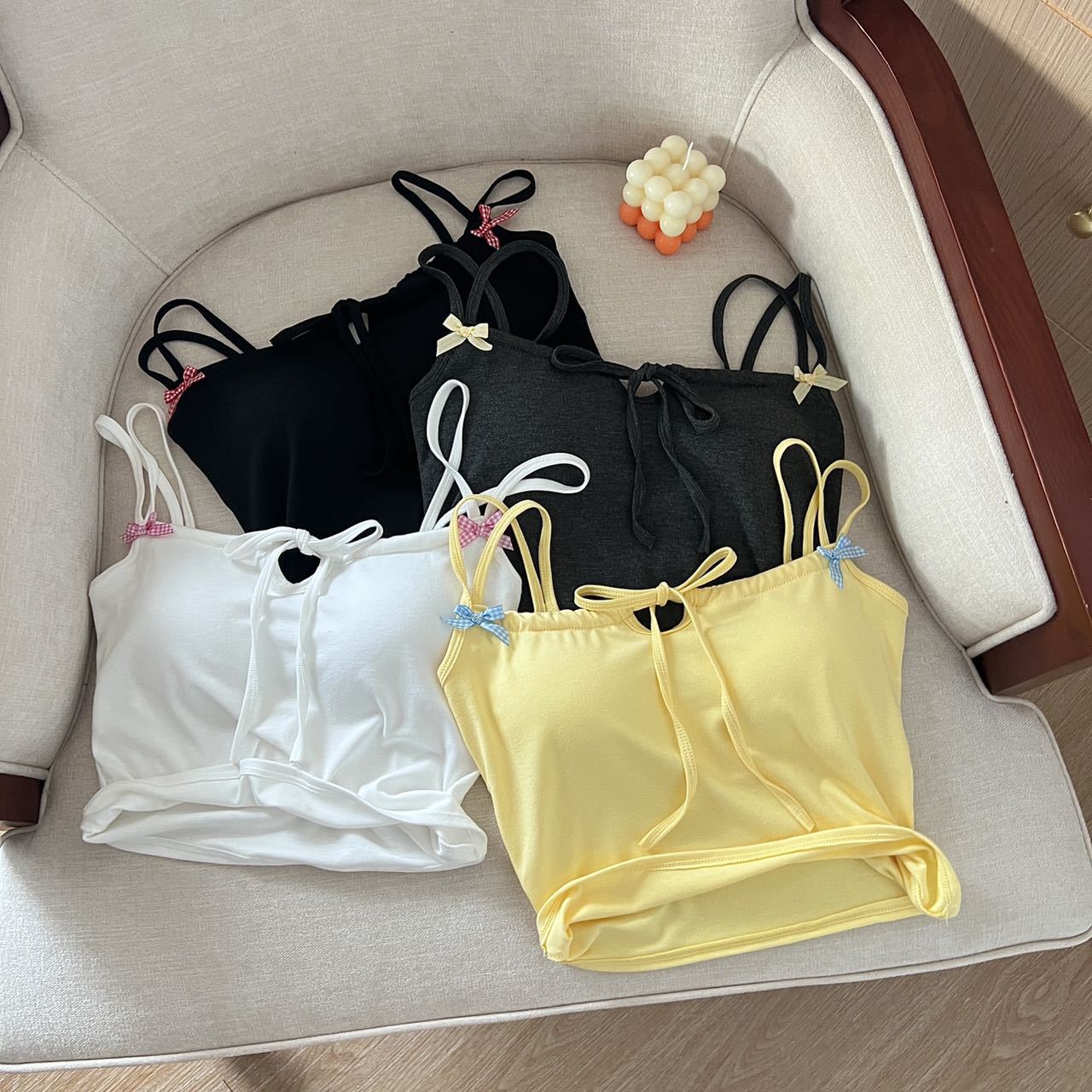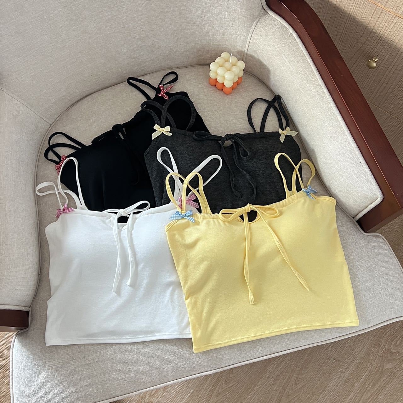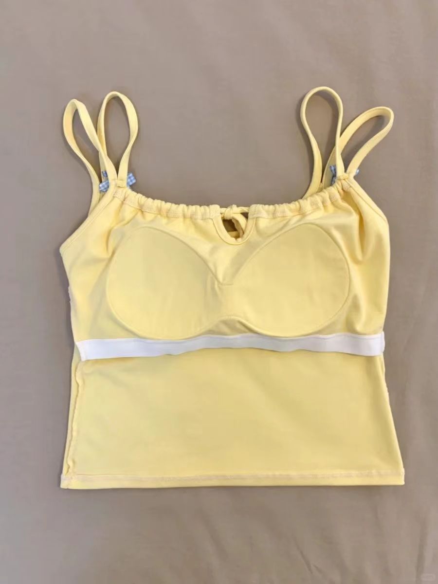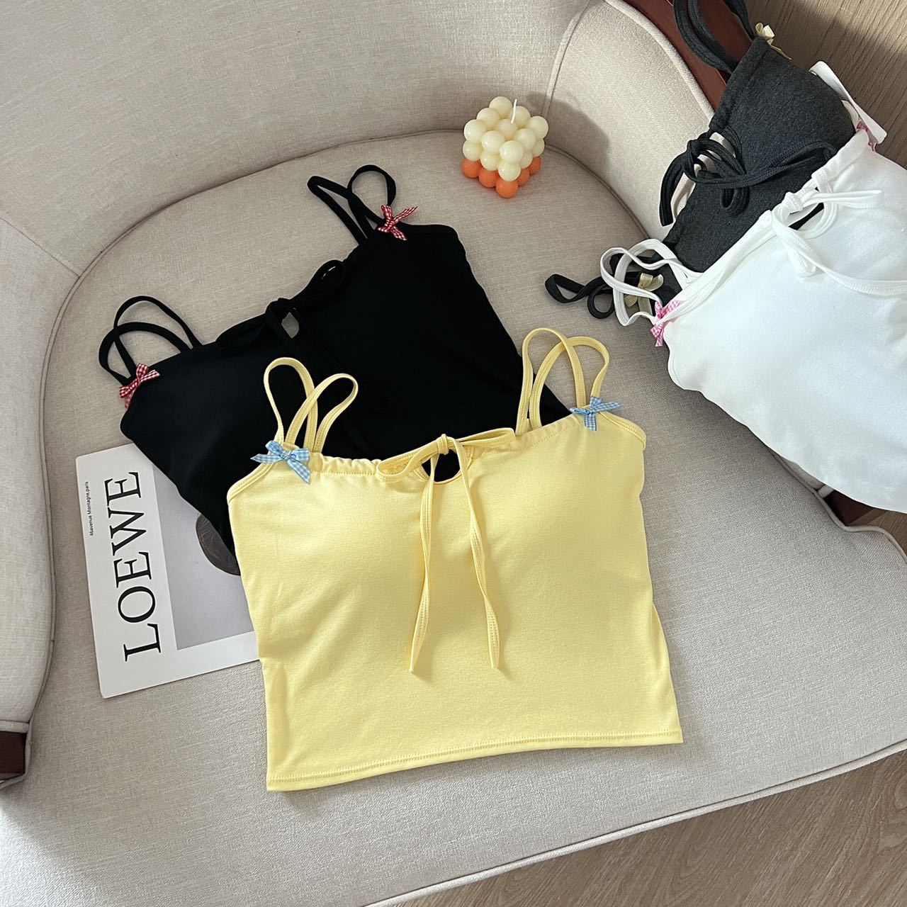 夏の清新なミルクの黄色の蝶結びのベストの女性の新型の甘い修身の短いタイプは胸のパッドの底の上着を持ちます。