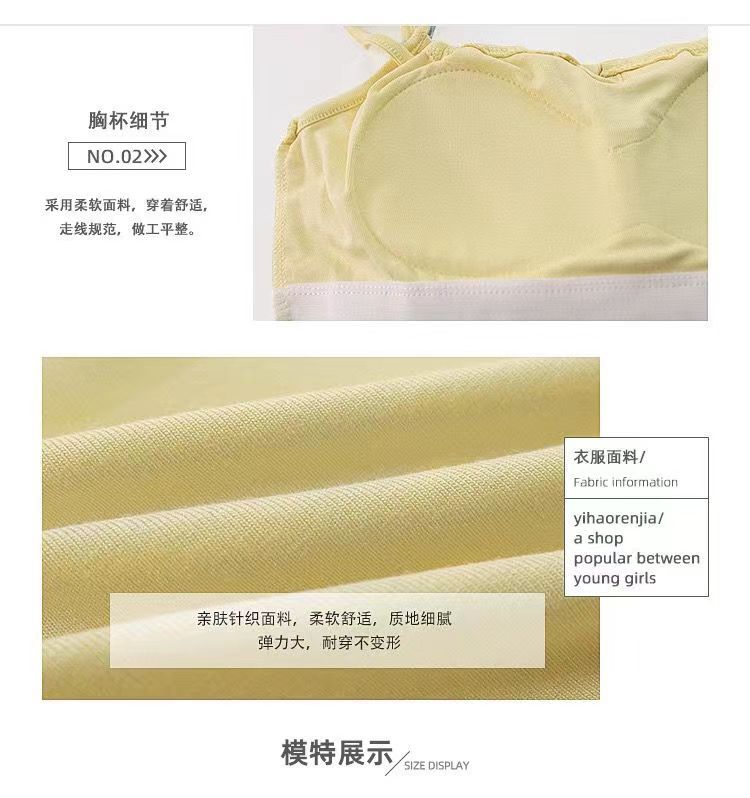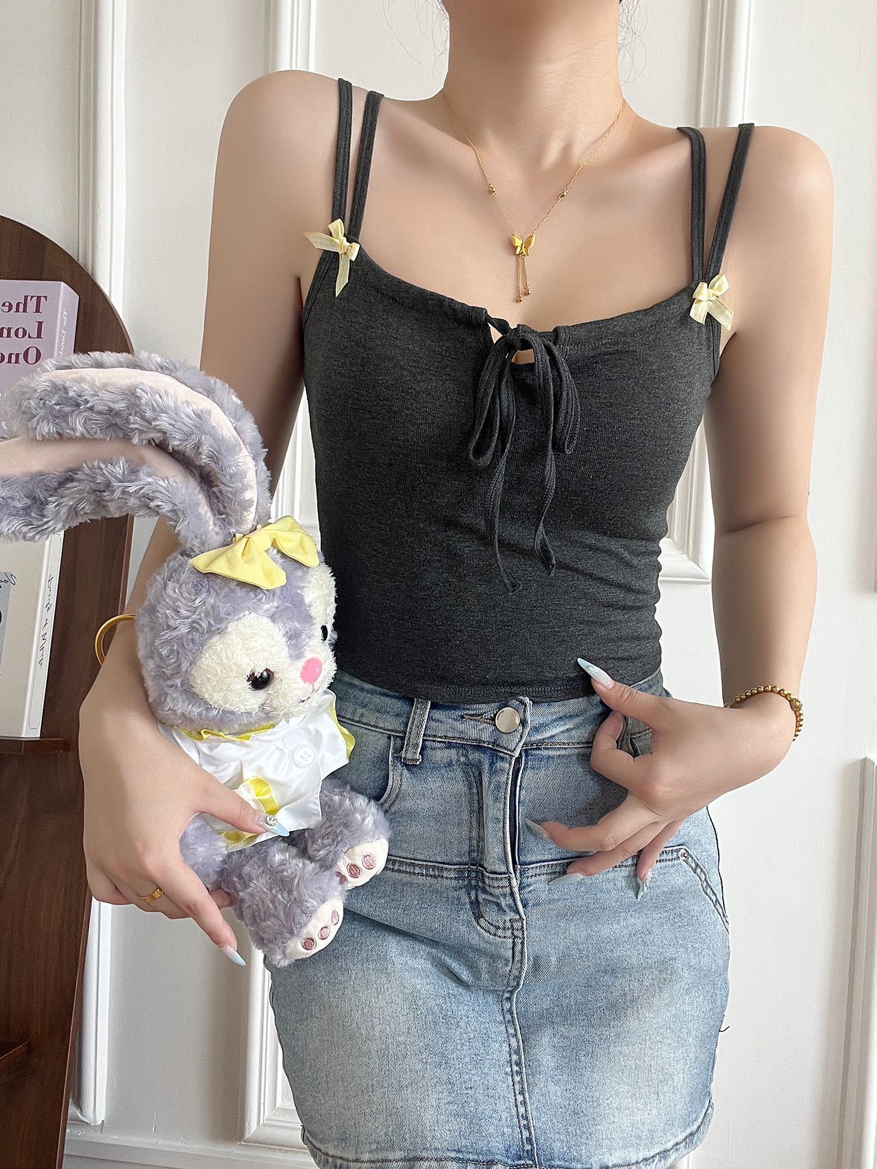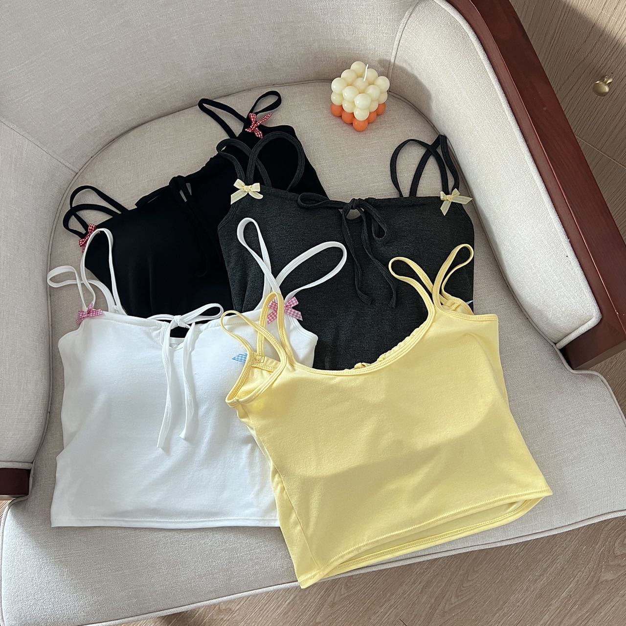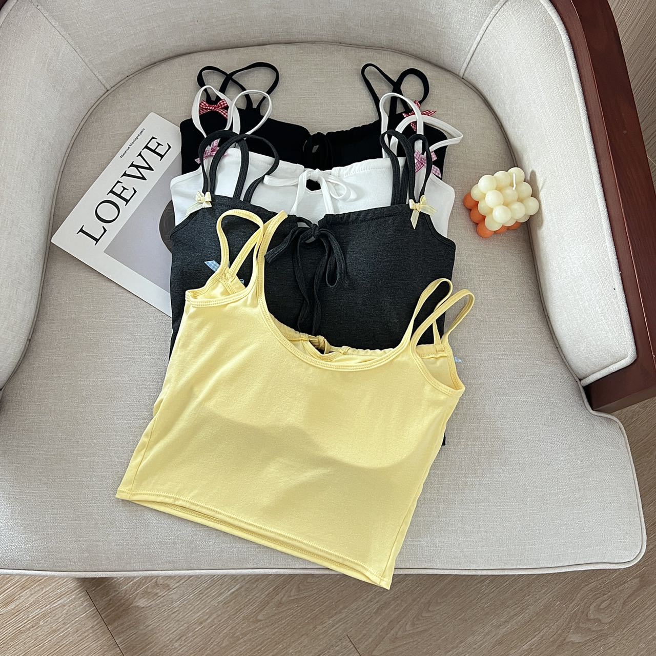 夏の清新なミルクの黄色の蝶結びのベストの女性の新型の甘い修身の短いタイプは胸のパッドの底の上着を持ちます。