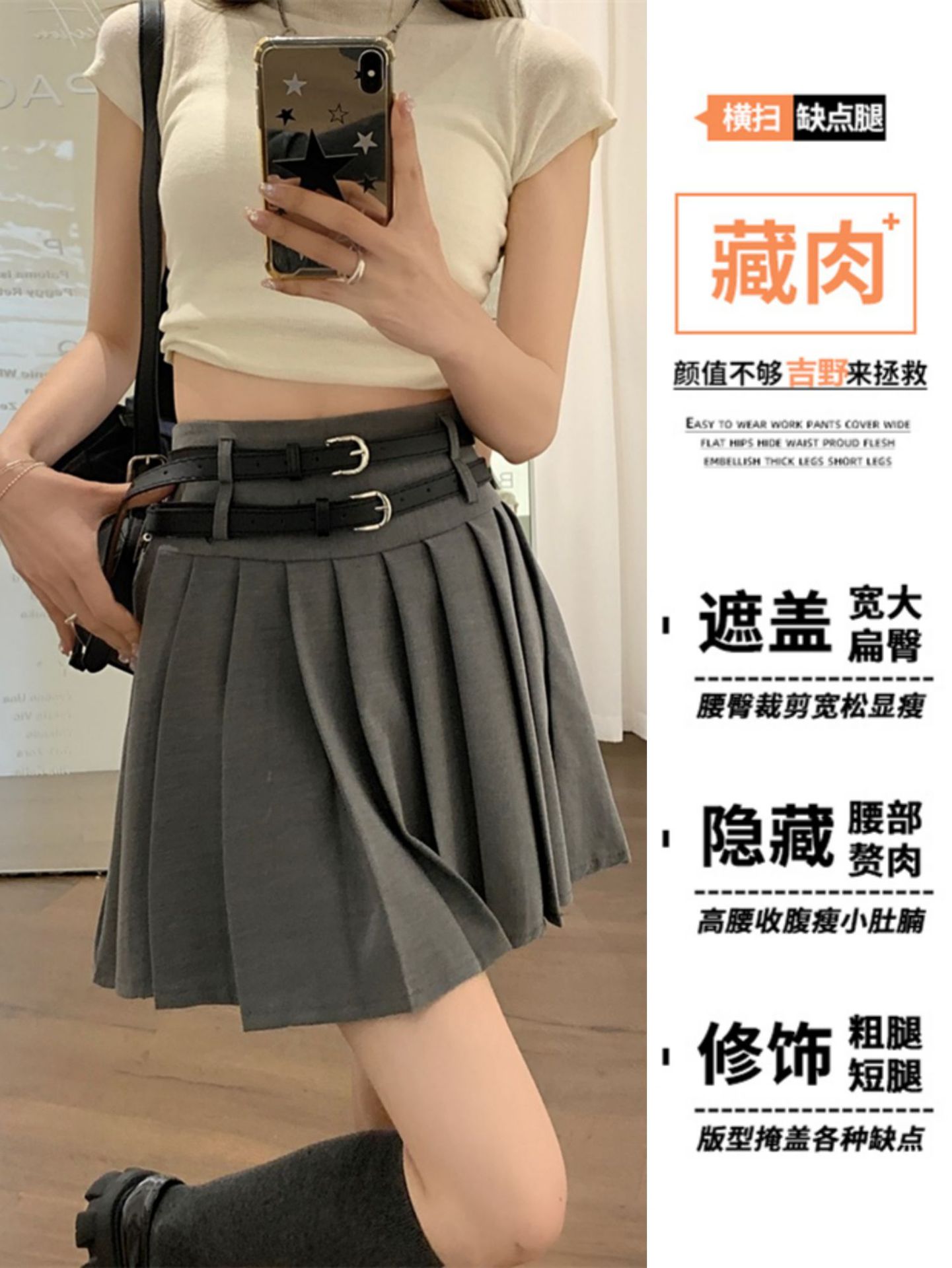 大きいサイズの甘くてクールなハイウエストのプリーツスカート、ぽっちゃり体型の女性向け秋のカレッジスタイルショートスカート、グレーのAラインスカート