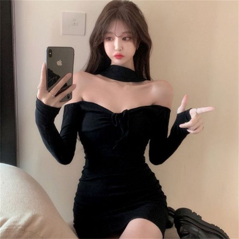 純粋な欲風の黒い肩のセクシーなギャルの長袖のワンピースの女性の秋冬の金の修身はお尻のスカートの潮を包みます。