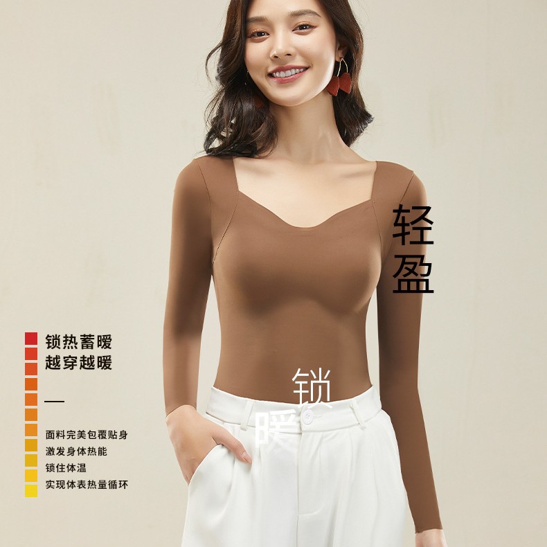 21303秋冬美肤衣打底长袖带胸垫保暖内衣无痕轻薄V领肌底上衣隐形
