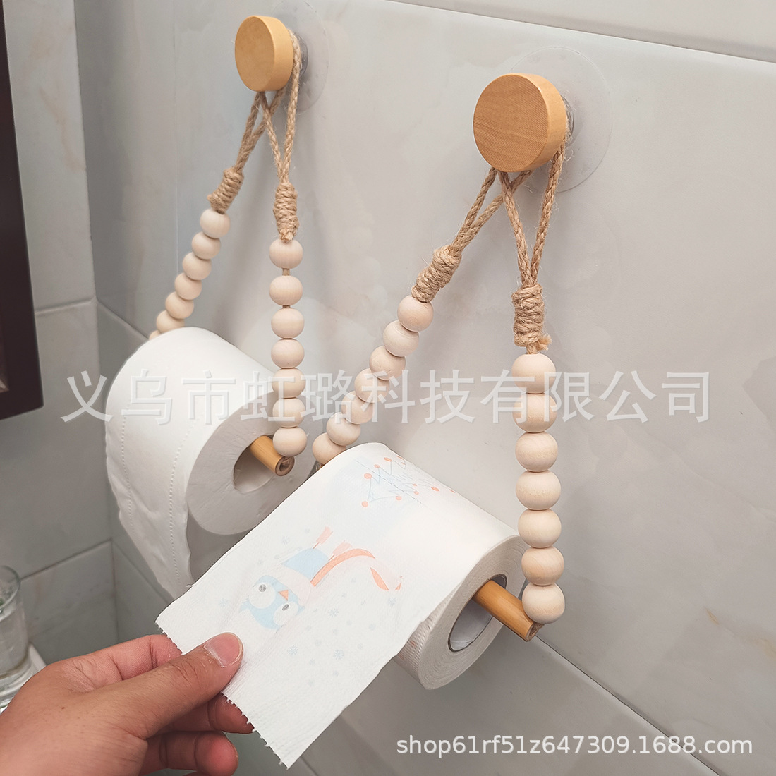跨境热销木珠珠麻绳免钉麻绳木棍纸巾架浴室卫生纸架毛巾架手工编