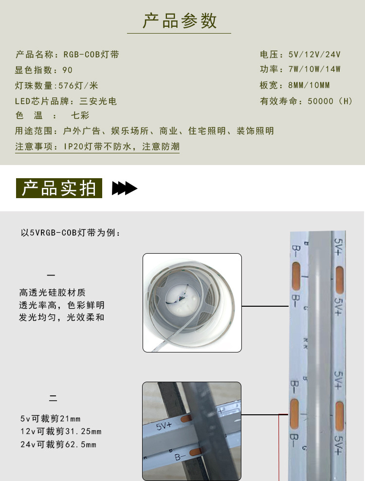 七彩COB灯带RGB576灯12V24V低压智能遥控变色酒吧装饰氛围LED灯条