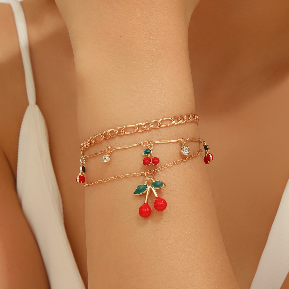 跨境欧美热销红色樱桃手链套装女夏季时尚小清新红色滴油多层手链