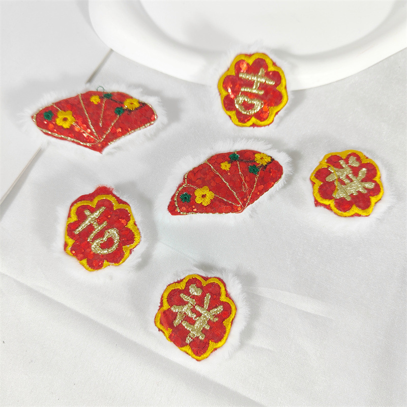 新年の赤いスパンコール刺繍吉祥扇子のぬいぐるみアクセサリー