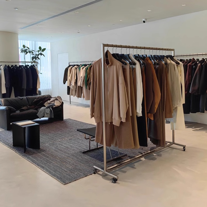 洋服店の展示棚が着地した中島ステンレス製の糸を引いた直播間に車輪付き移動式ハンガー付きの婦人服店がある