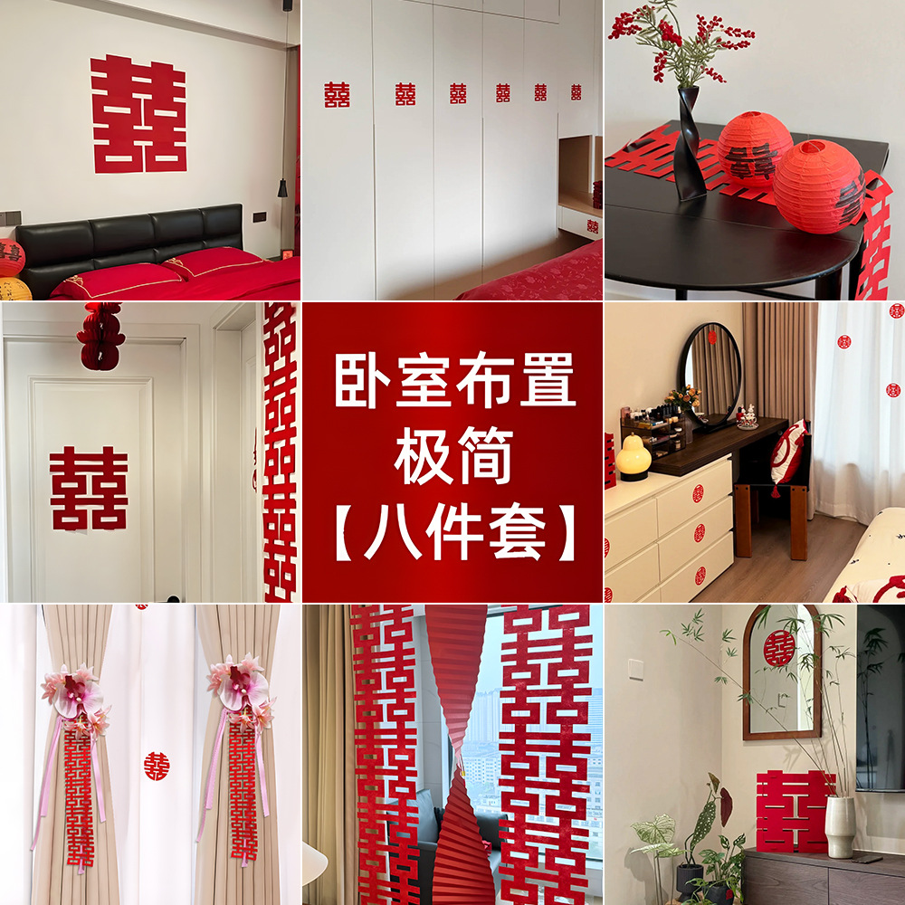 婚房布置女方卧室简单大气床头背景墙全套装饰结婚男方新房喜字贴