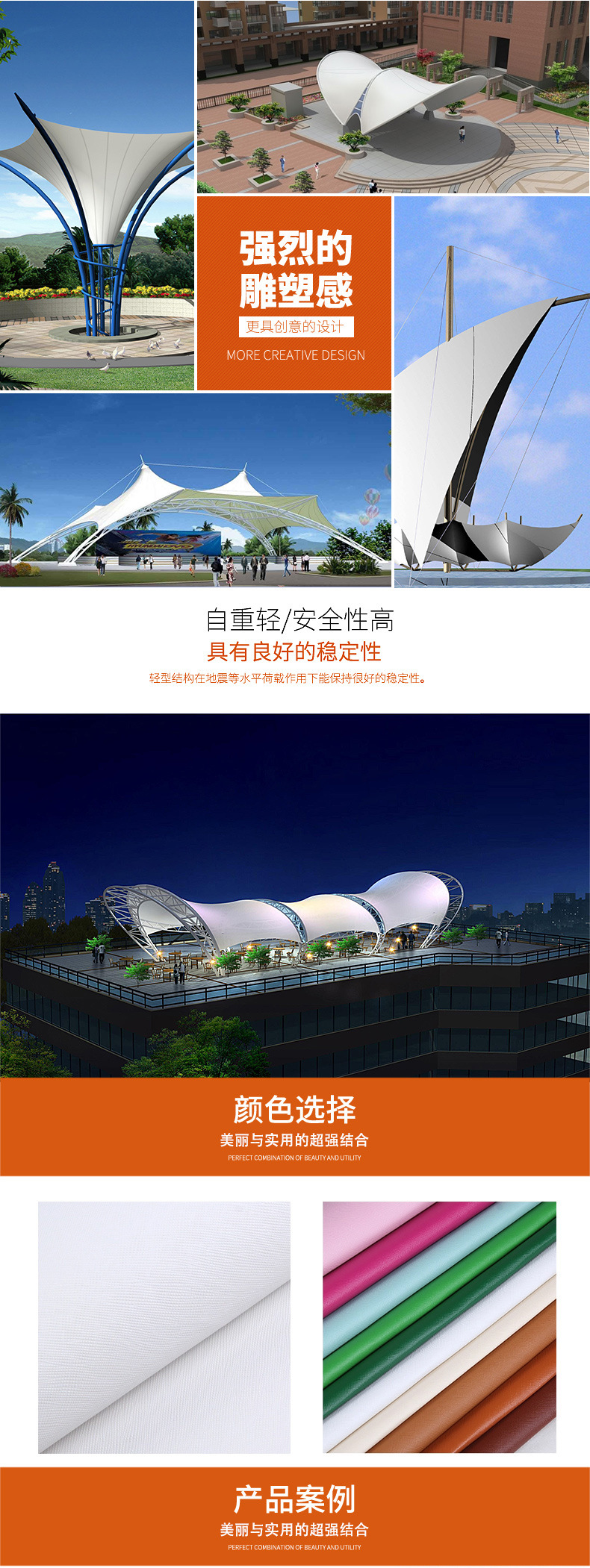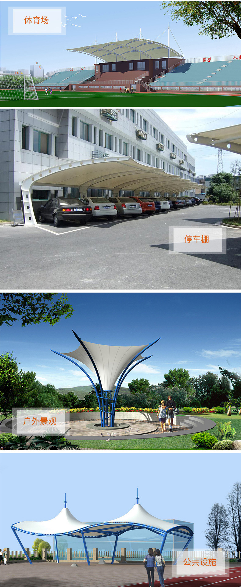 張力膜PVC/PVDF膜材ETFE膜布車庫鉄骨構造景観膜構造テント布デザイン