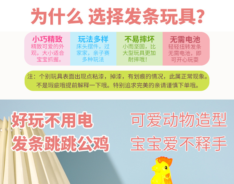 上足发条,一个公鸡会在地上跳走哦!喜欢上链玩具的买家就选择这款吧!