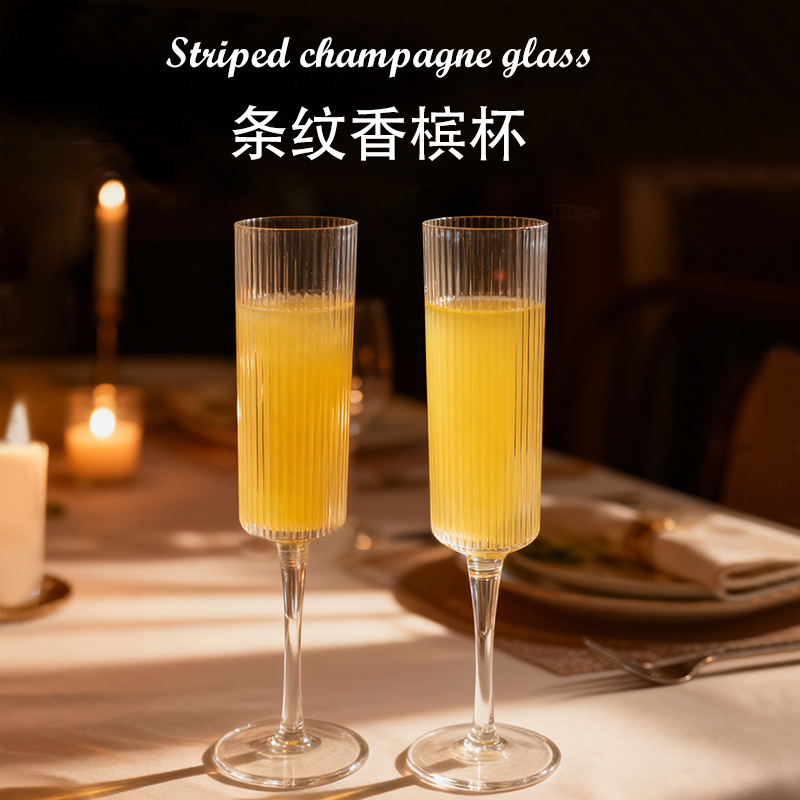 竖纹香槟杯180ml 条纹红酒杯塑料饮料杯果汁杯透明高脚杯亚马逊