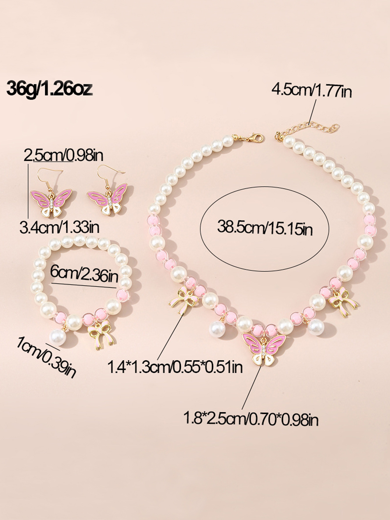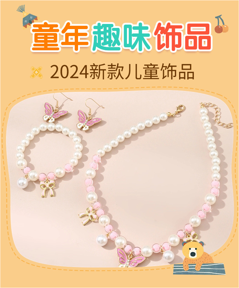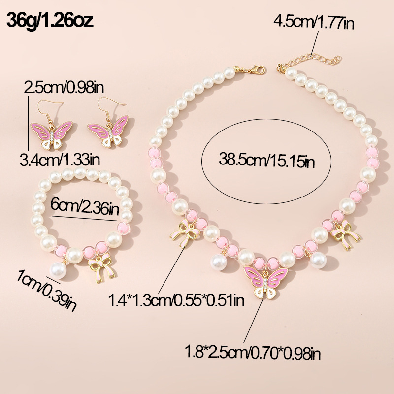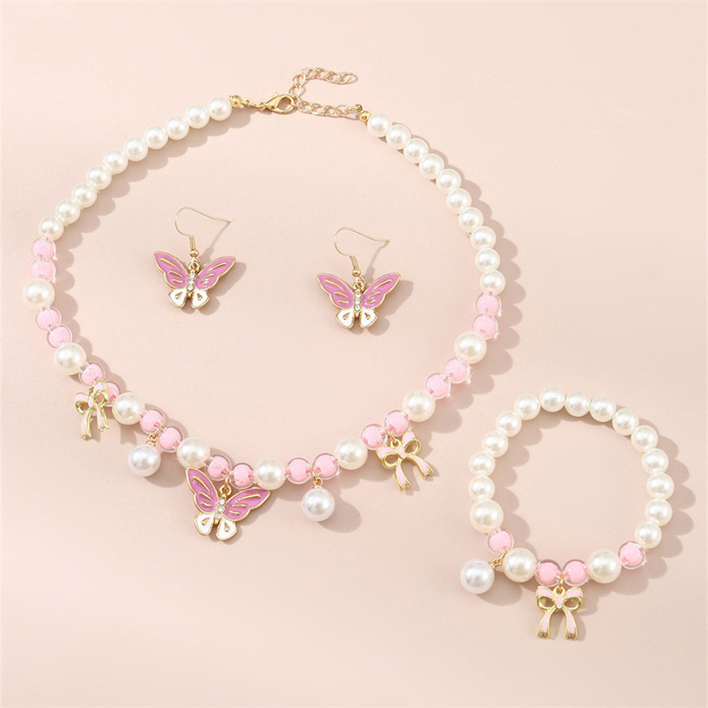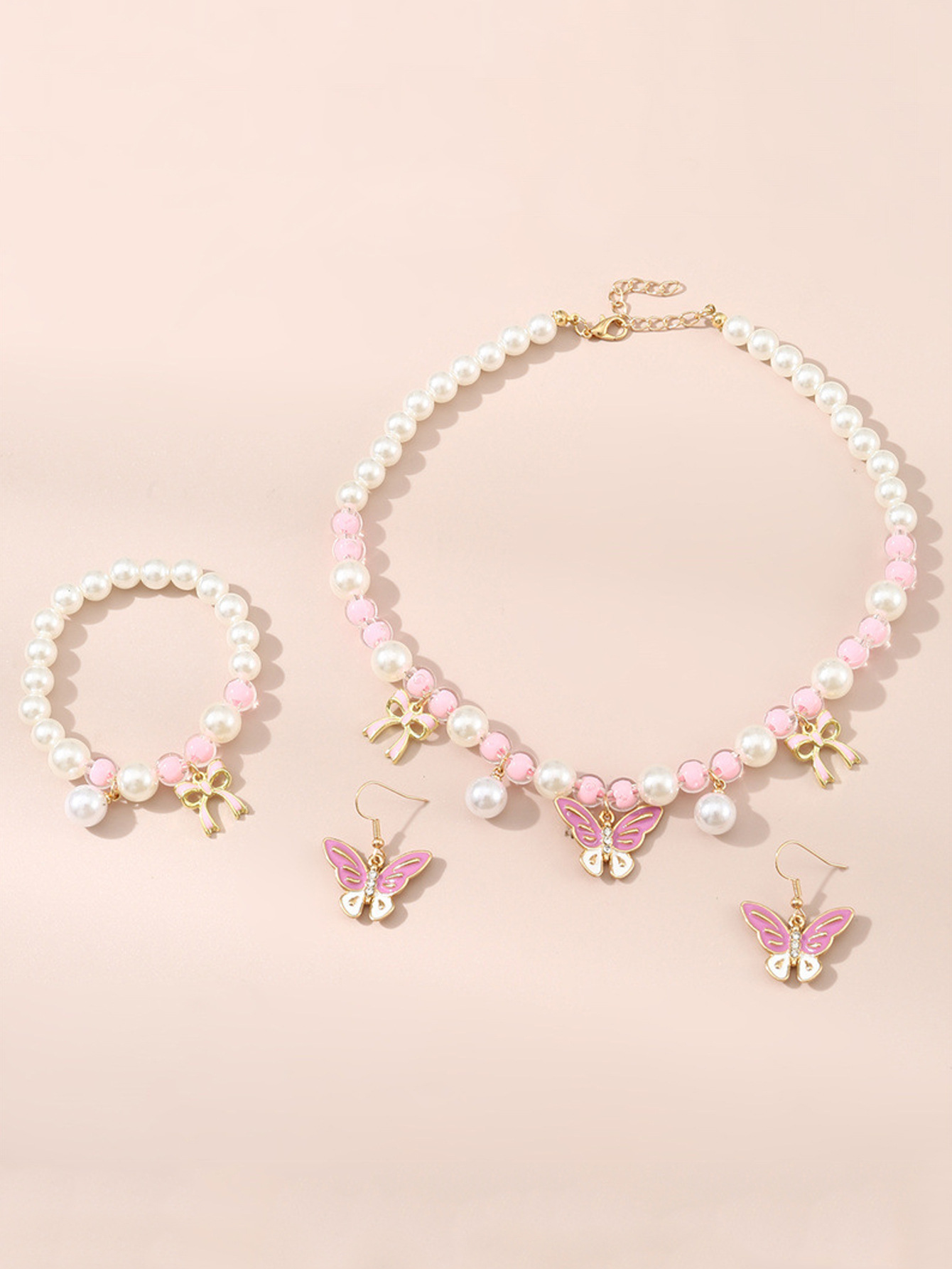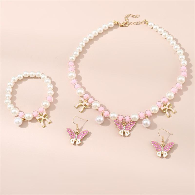 子供用アクセサリー新作ネックレスブレスレットピアスセットスイミー风ピンク系パールビーズ蝶ペンダント