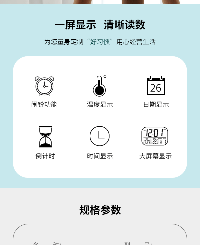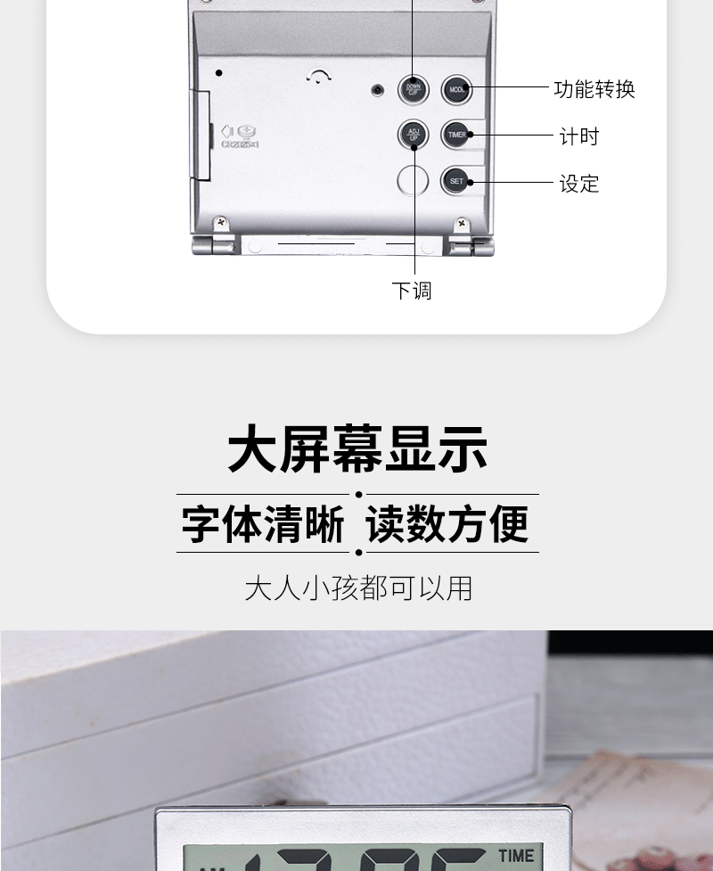 功能:时间,计时器,温度计,日历,贪睡,电子电池,倒计时,闹钟,12/24小时转换。