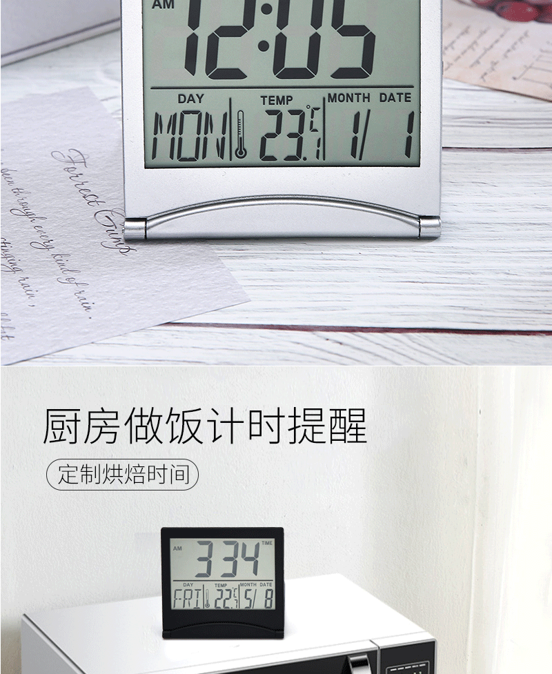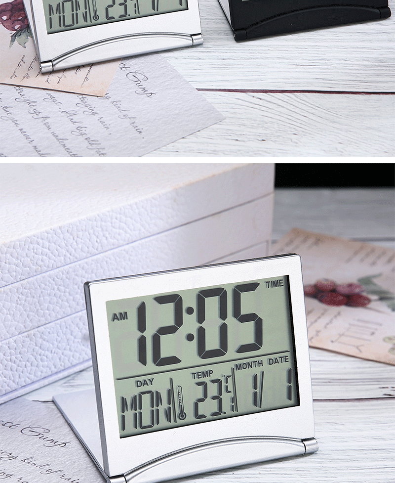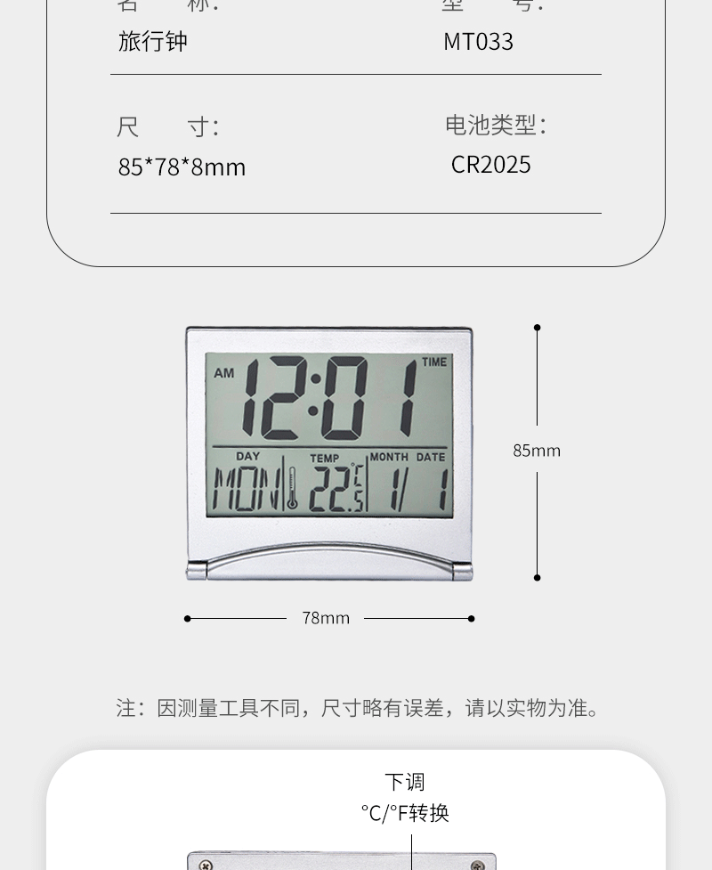 产品名称:折叠旅行闹钟 产品规格:8.5*7.8*1.3cm