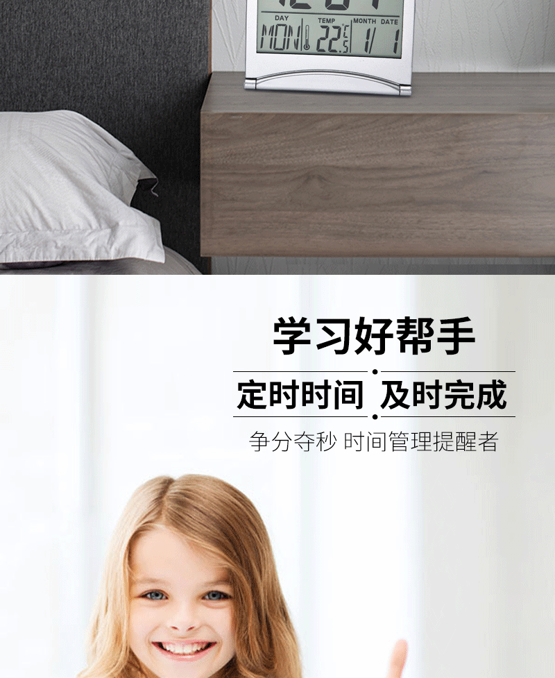 4.计时器模式可设置反向计时;计时范围23:59-00:00小时。当时间到达时,会响闹提示。