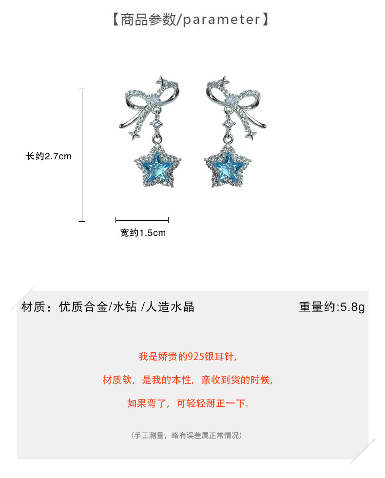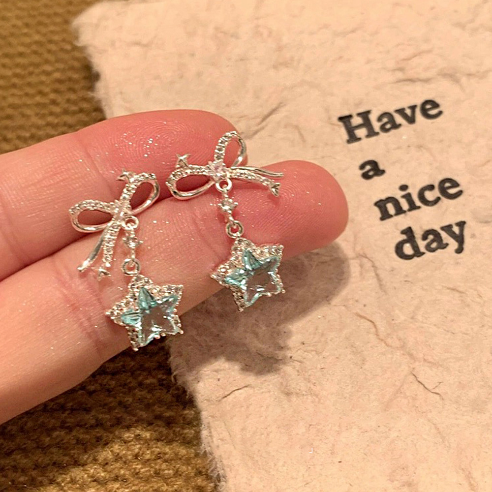 S925銀の針の蝶結びの明るいドリルのピアスの清新で甘い五角星のイヤリングの大衆の設計の高級感の耳飾りの女性