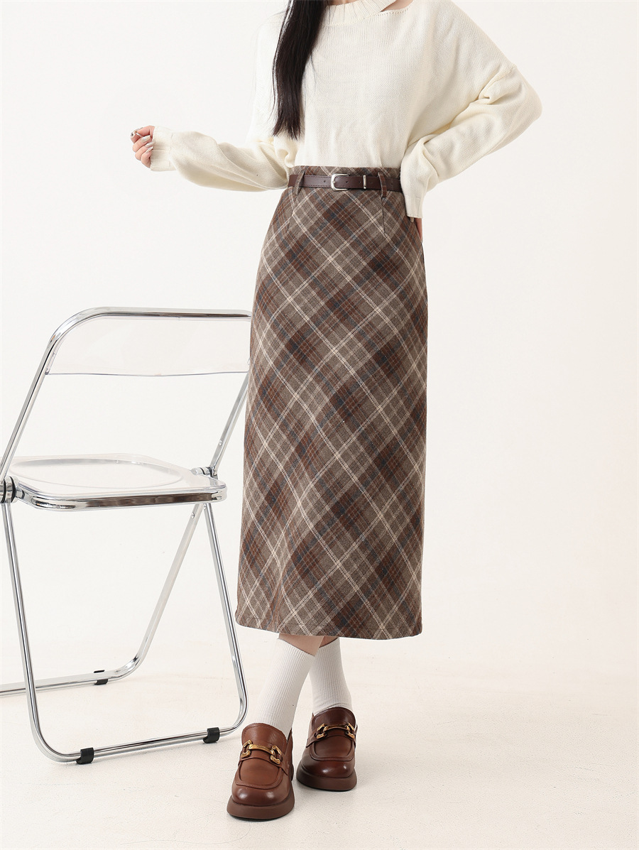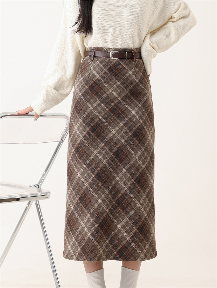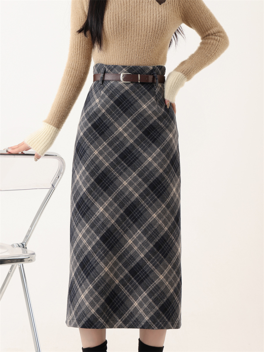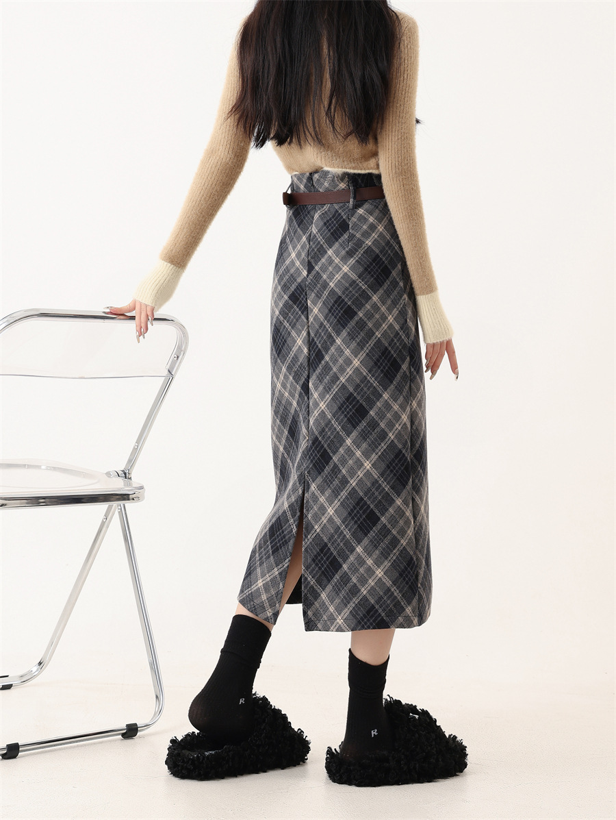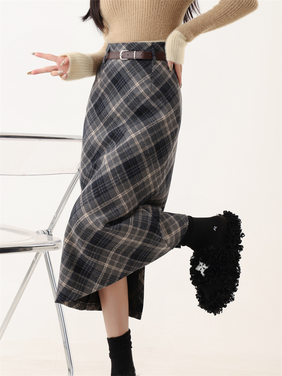 实拍毛呢格子半身裙女2025秋冬高腰A字包臀开叉格纹长裙配腰带