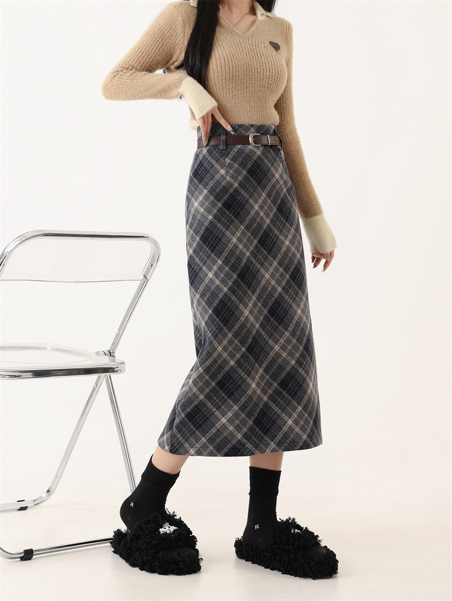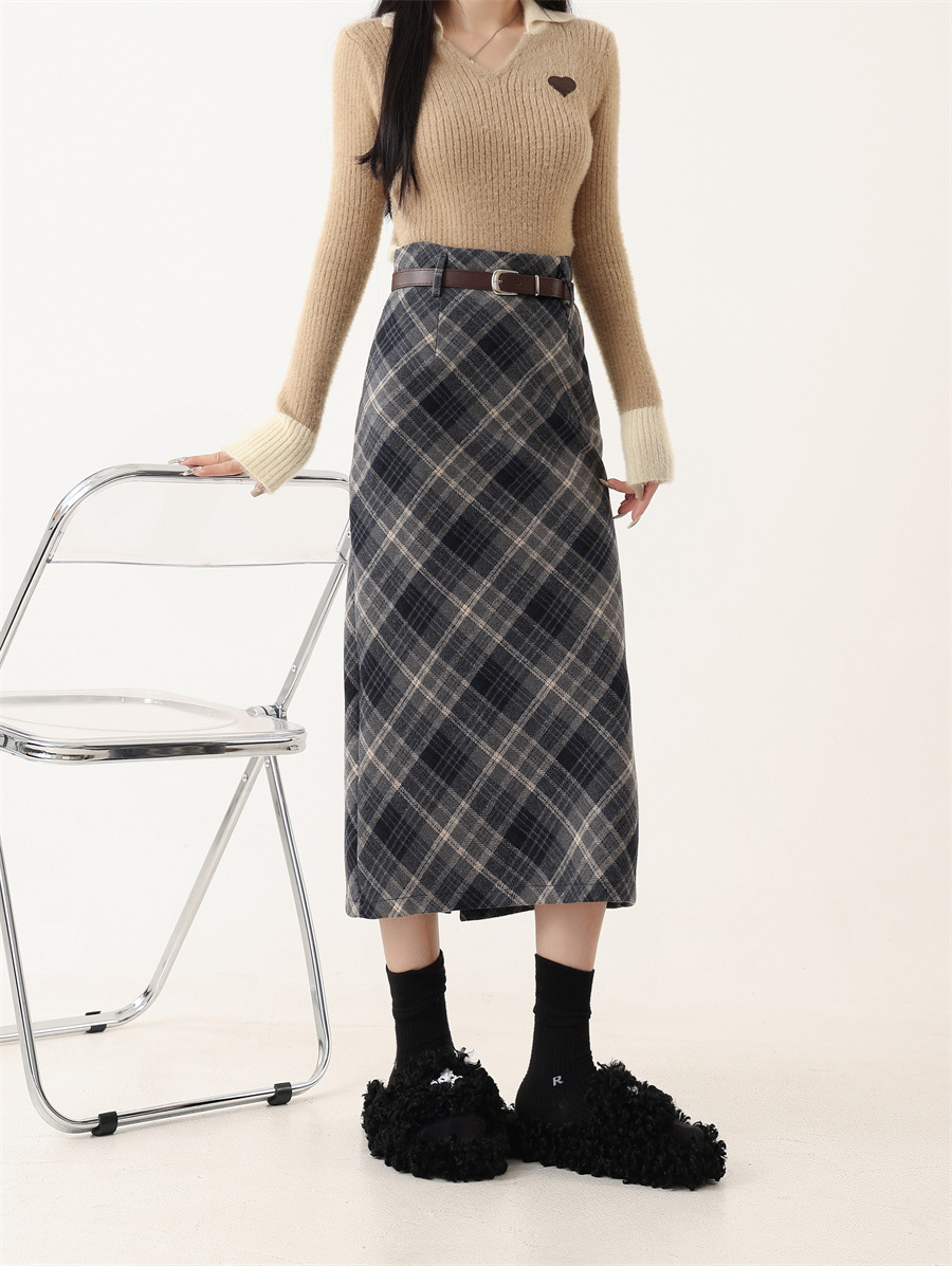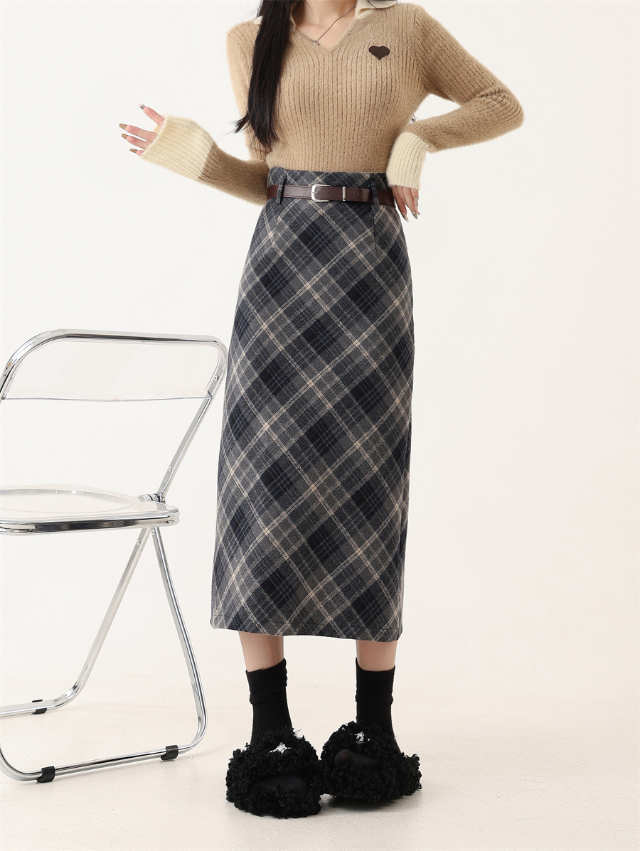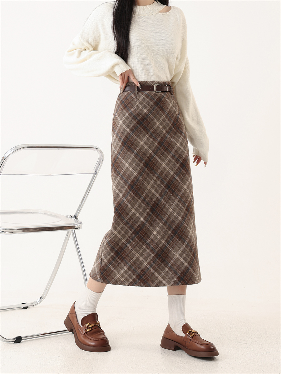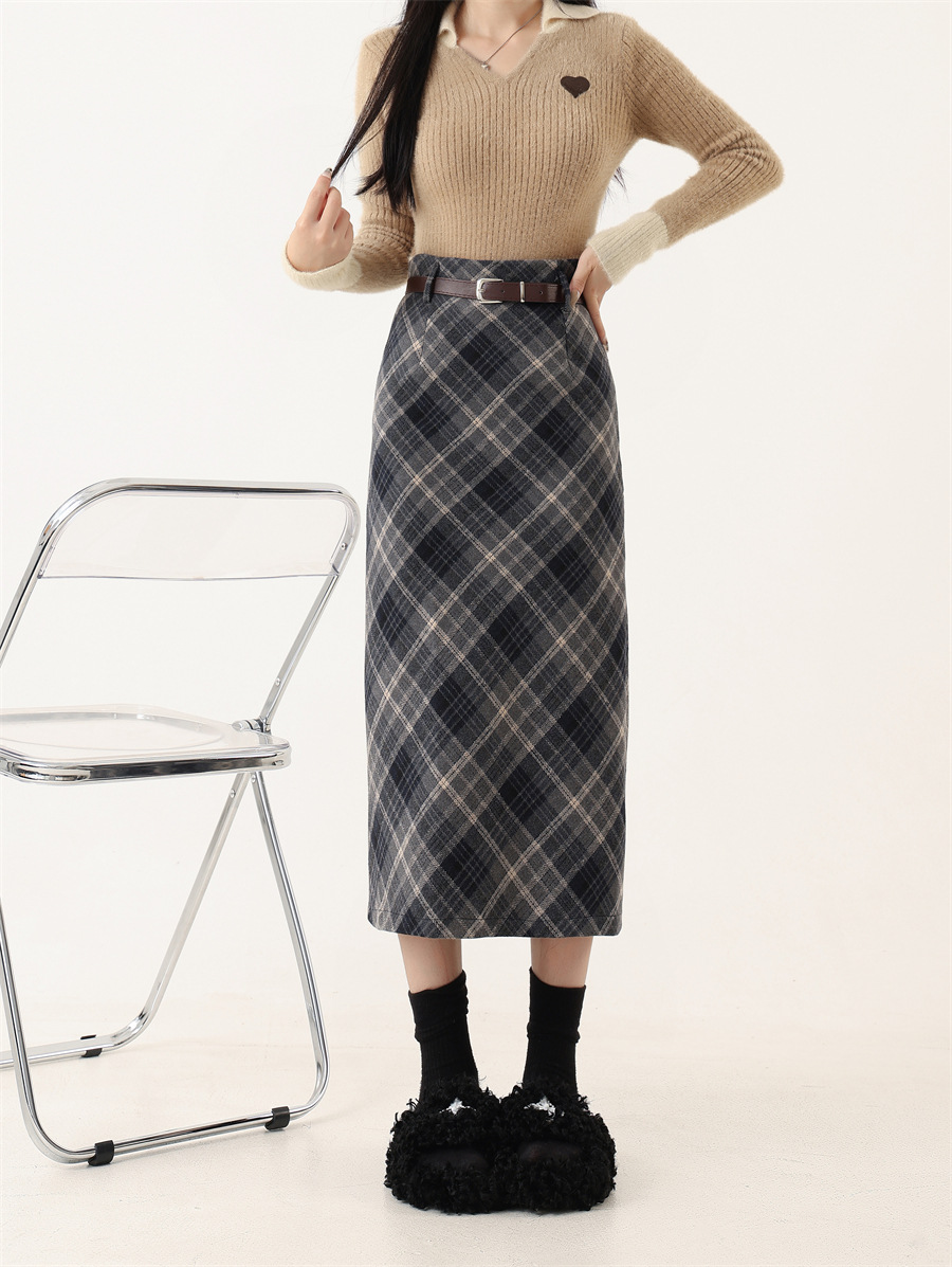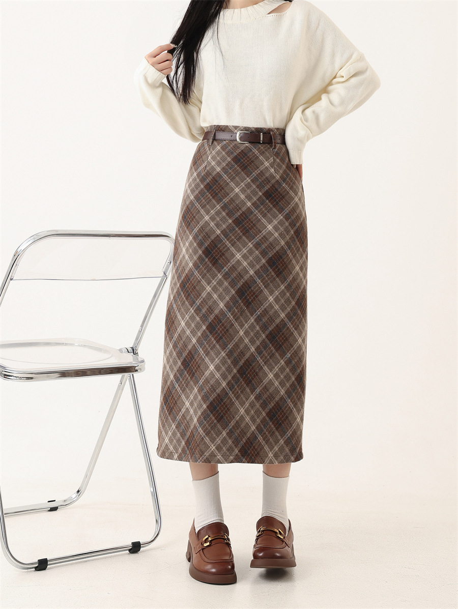 实拍毛呢格子半身裙女2025秋冬高腰A字包臀开叉格纹长裙配腰带