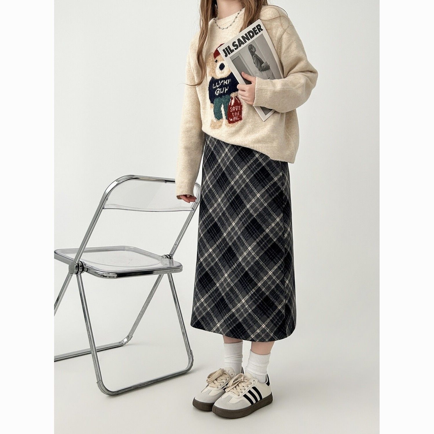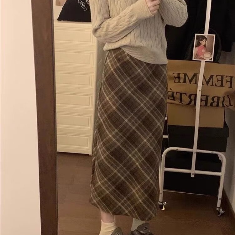 复古毛呢格子半身裙女秋冬高腰显瘦中长款a字裙百搭包臀裙