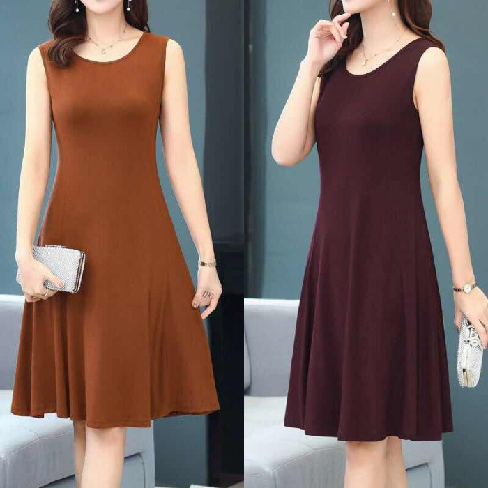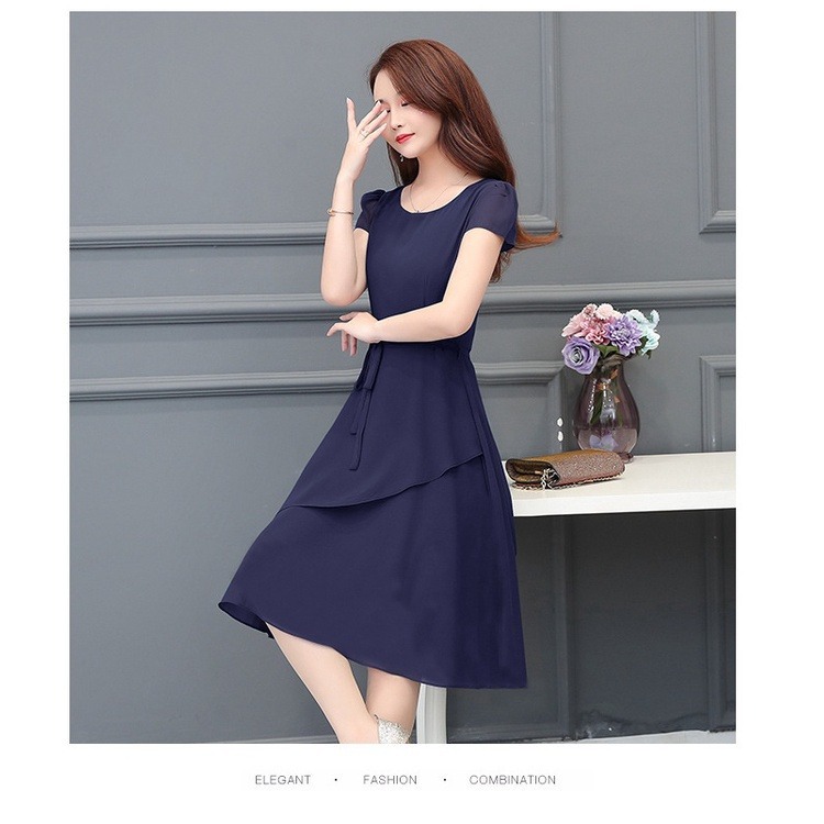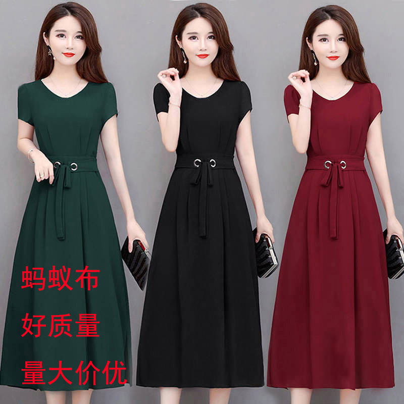 夏の新しいスタイルのスリムで年齢を軽減するスカート、ミドル丈のA型ラウンドネック、大きいサイズのゆったりとした婦人服ドレス