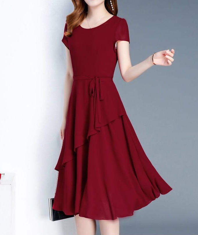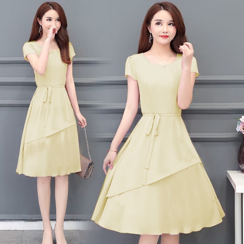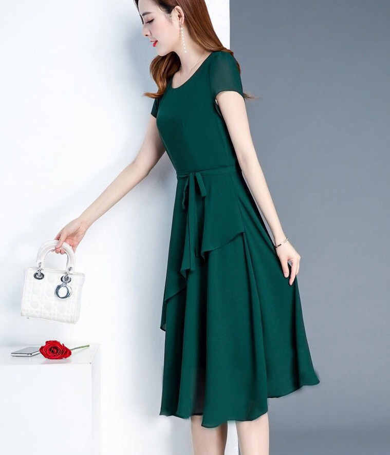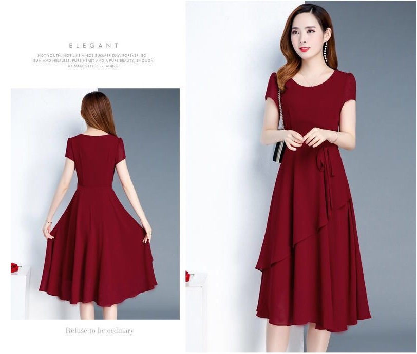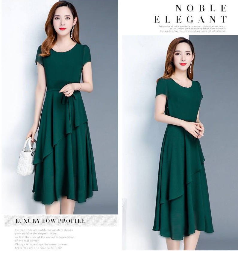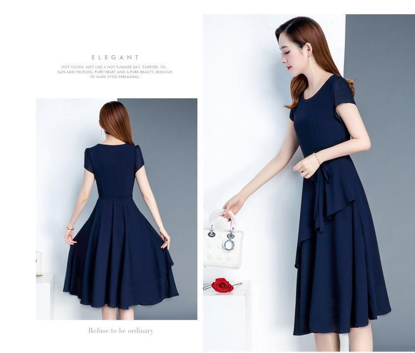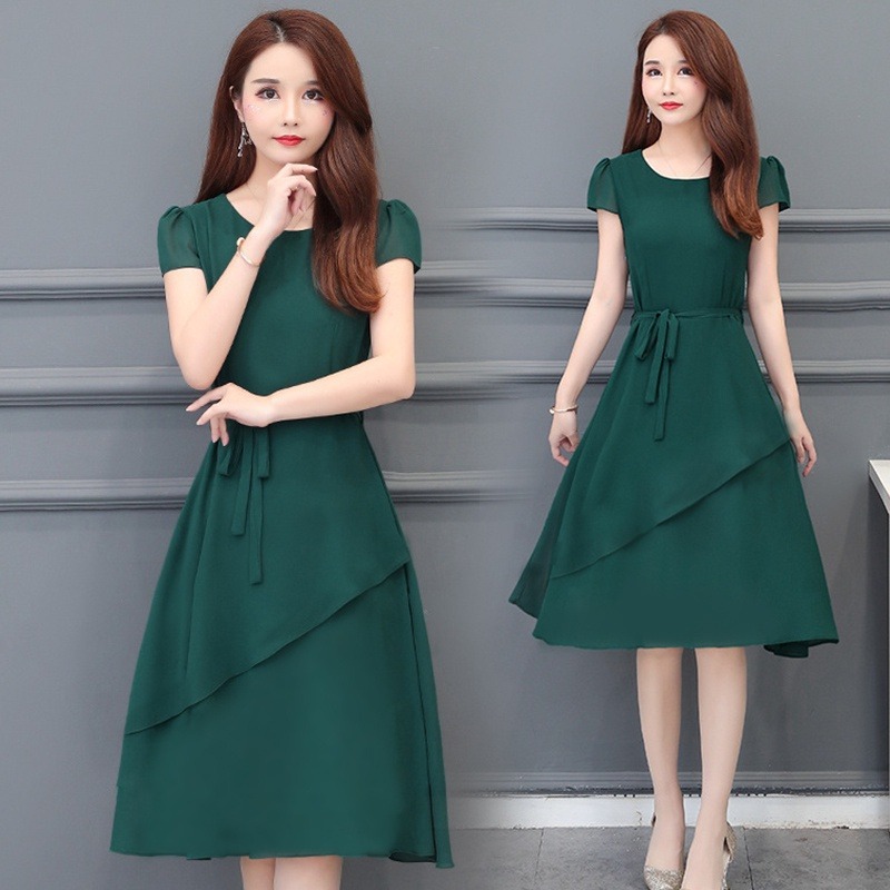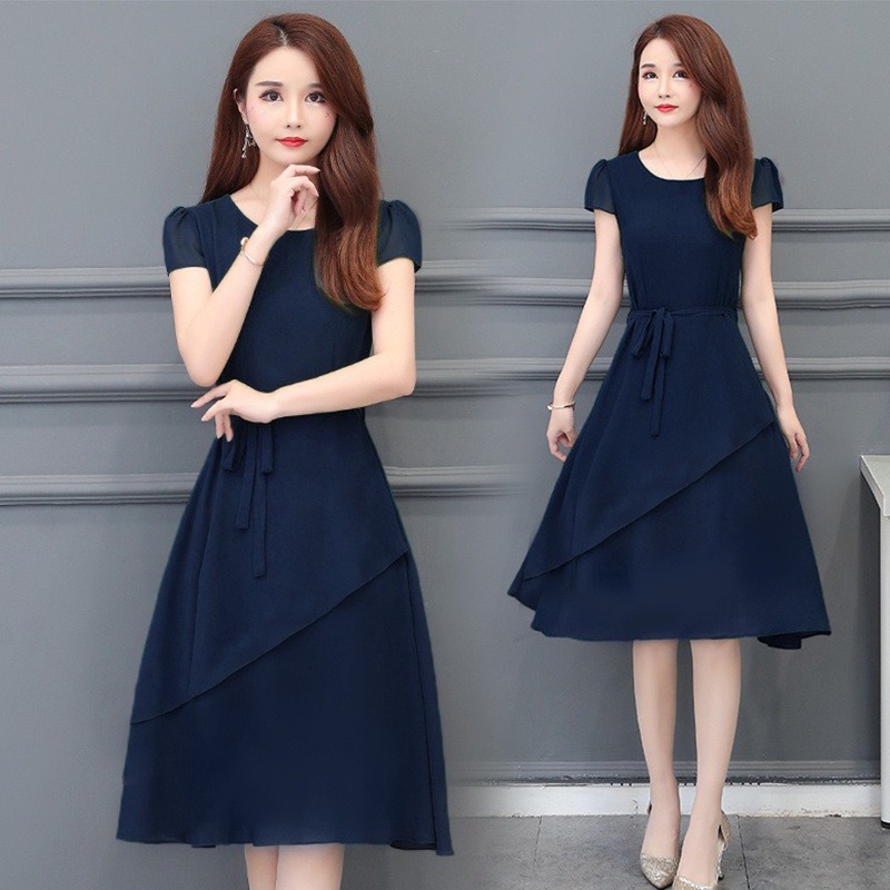 夏のハイエンドウエスト痩身と年齢軽減スリム気質ミドル丈A型ラウンドネック大きいサイズゆったりレディースドレス