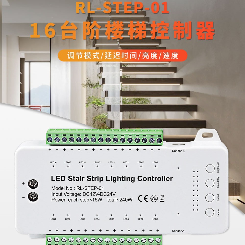 智能网红楼梯12-24V跑马踏步PIR感应踏步16台阶LED楼梯灯条控制器
