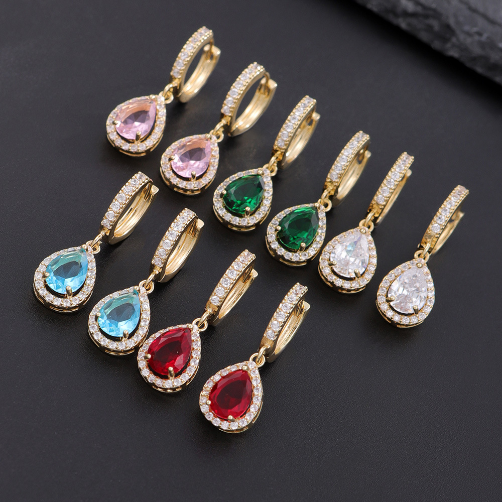 欧米のクロスボーダーの幾何学的な形の水滴の耳のボタンのスーツの真金の保色の処理のマイクロカラーのジルコンの愛の桃の心の耳飾り