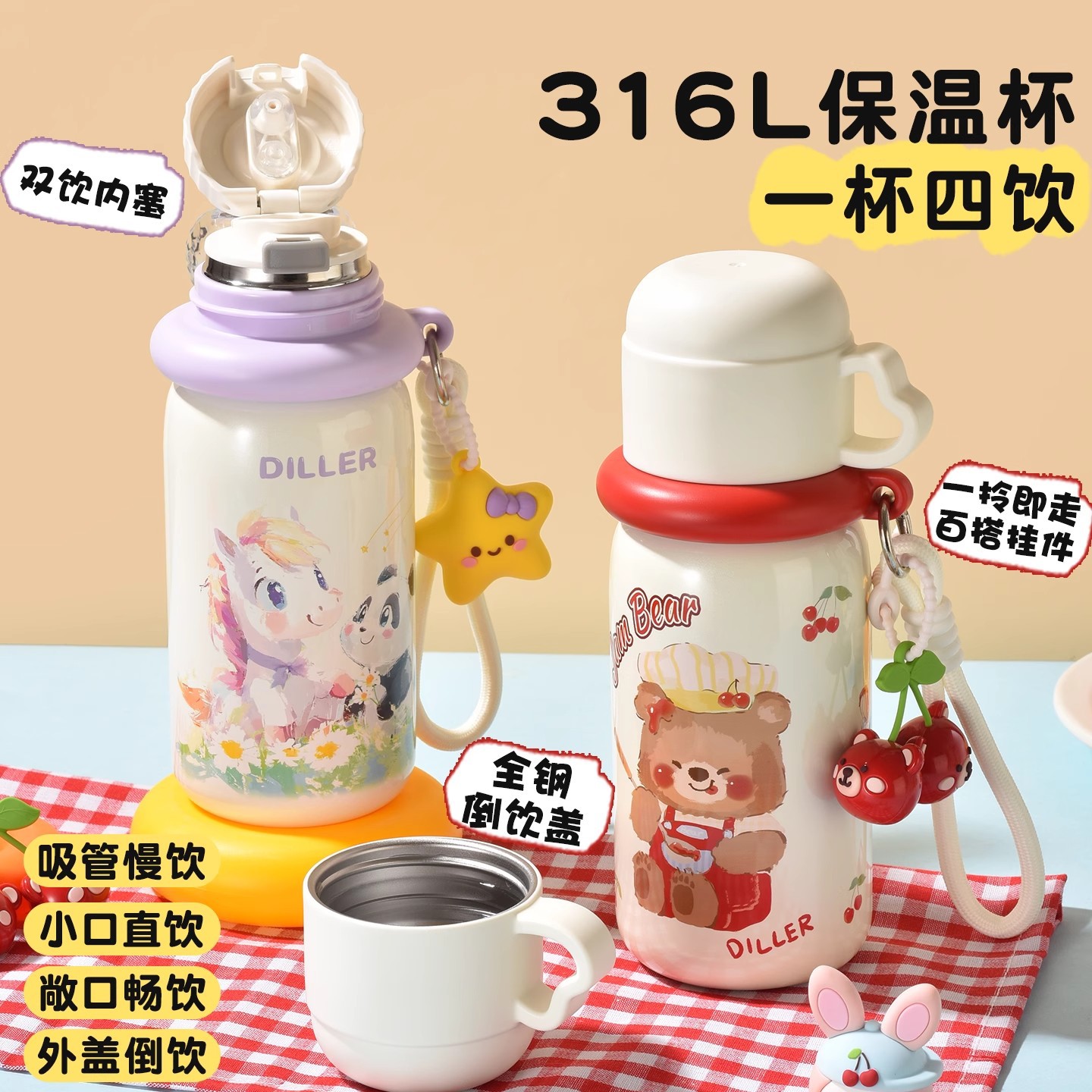 迪乐贝尔新款樱桃熊316不锈钢保温杯女生便携提绳高颜值喝水杯子