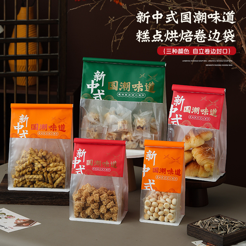 新中式棉纸牛皮纸八边封烘培包装袋国朝塑料卷边封口八边封自立袋
