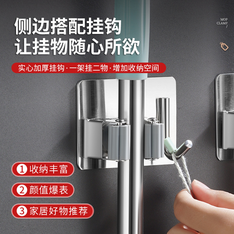 ステンレス製モップクリップフックトイレ多目的モップホルダー穴なしほうきクリップ固定モップほうき収納棚
