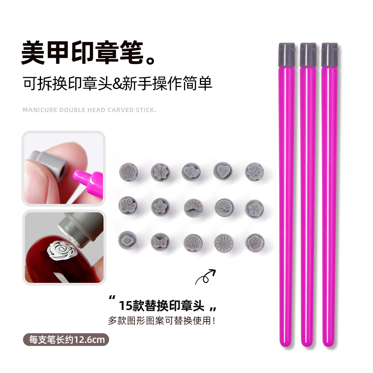 新款美甲印章笔套装花卉图案可替换硅胶转印头转印笔美甲工具批发