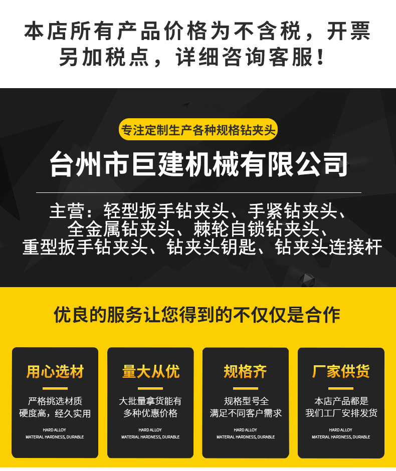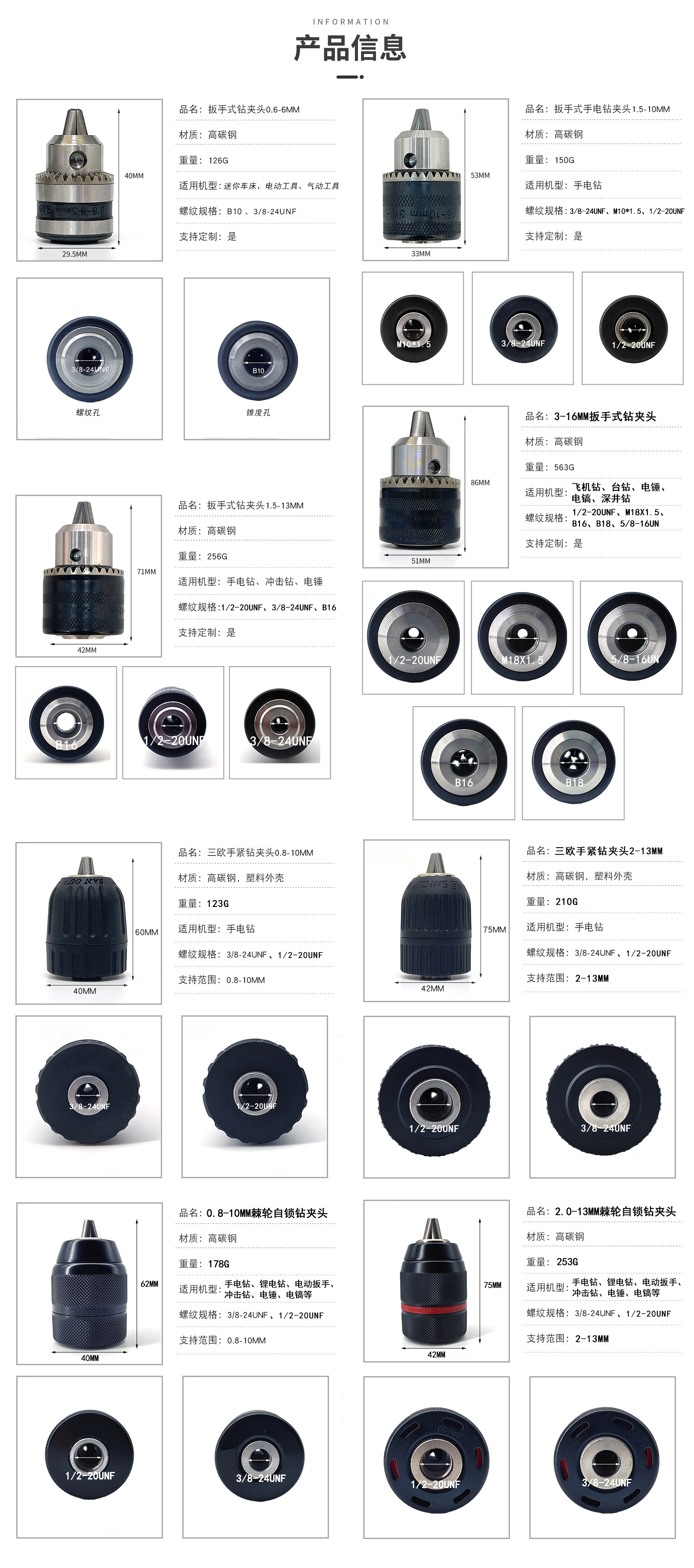仕様とモデル 0.6-6.5MMレンチドリルチャック,1.5-10MMレンチドリルチャック,1.5-13MMレンチドリルチャック,3.0-16MMレンチドリルチャック,0.8-10MM手締めドリルチャック,2.0-13MM ハンドタイトドリルチャック,0.8-10MM ラチェットセルフロックドリルチャック,2.0-13MM ラチェットセルフロックドリルチャック,0.8-10MMオールメタルドリルチャック,2.0-13MMオールメタルドリルチャック,0.8-10MMオールメタルドリルチャック(シングルセット),0.8-10MM ラチェット式セルフロックドリルチャック (シングルセット),2.0-13MM ラチェット式セルフロックドリルチャック (シングルセット),0.8-10MMセミメタルドリルチャック,2.0-13MM セミメタルドリルチャック