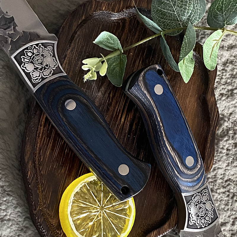 ナイフ フルーツナイフ 刀具 金属製 染色牛骨ハンドル ダマスカス鋼刃材 245g シース付き