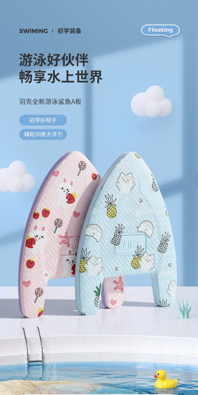 アニメの水泳の浮き板の背が漂っています。初心者は水泳の補助装備を勉強します。