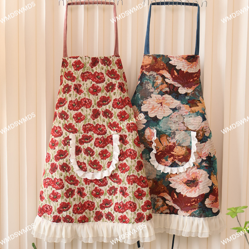 家庭用キッチン調理用高級感のあるホルターネックエプロン、フレンチレースエプロン、大きなポケット付き花柄作業服、卸売