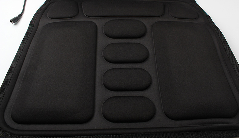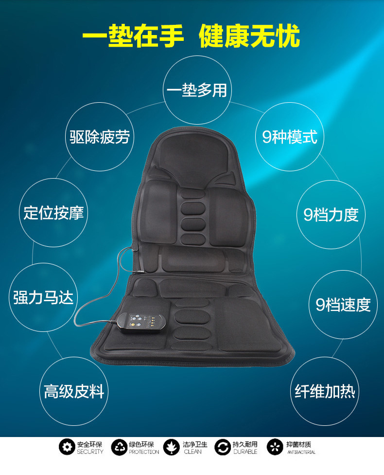 本产品采用12V稳压电源,微电脑控制,8种按摩模式自由交换,5-30分钟定时可调,自动关机,多功能震动按摩,车室两用,便携式,可坐可卧.