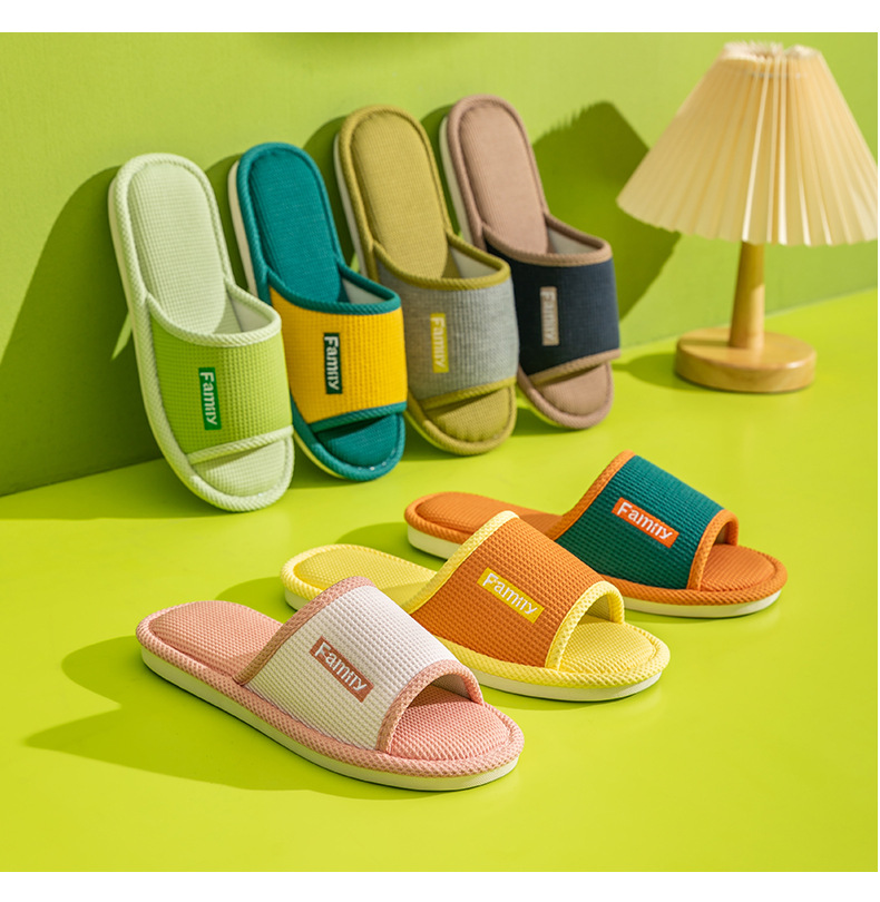 屋内および家庭用リネンオープンスリッパ、春と秋の季節の生地、吸汗性の綿とリネンの厚い底、カップル向けの足踏み感卸売