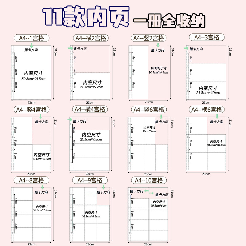 A4カードアルバム内側透明8グリッドルーズリーフ替芯 ポラロイド写真テスト用紙フォトカード学習カード収集保管卸売
