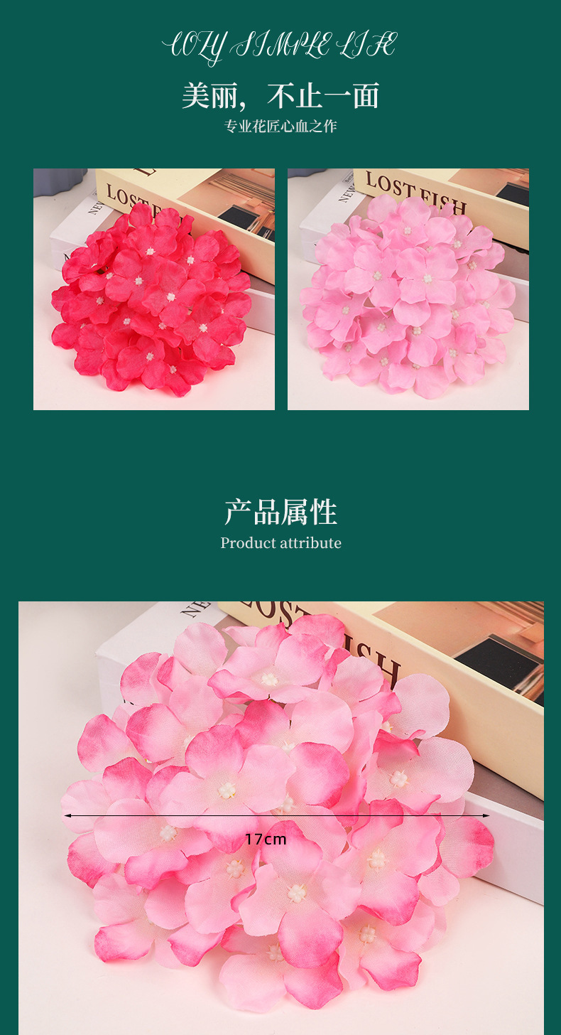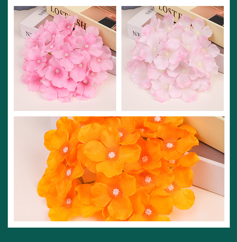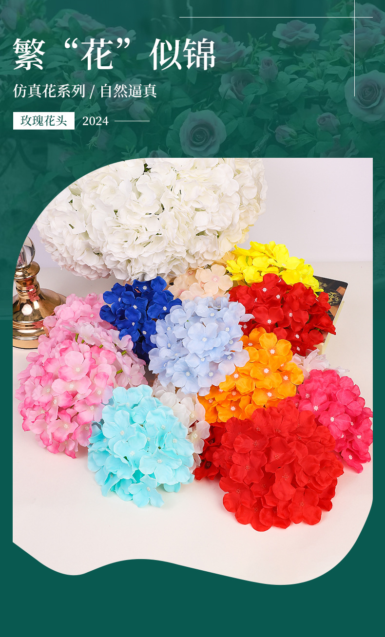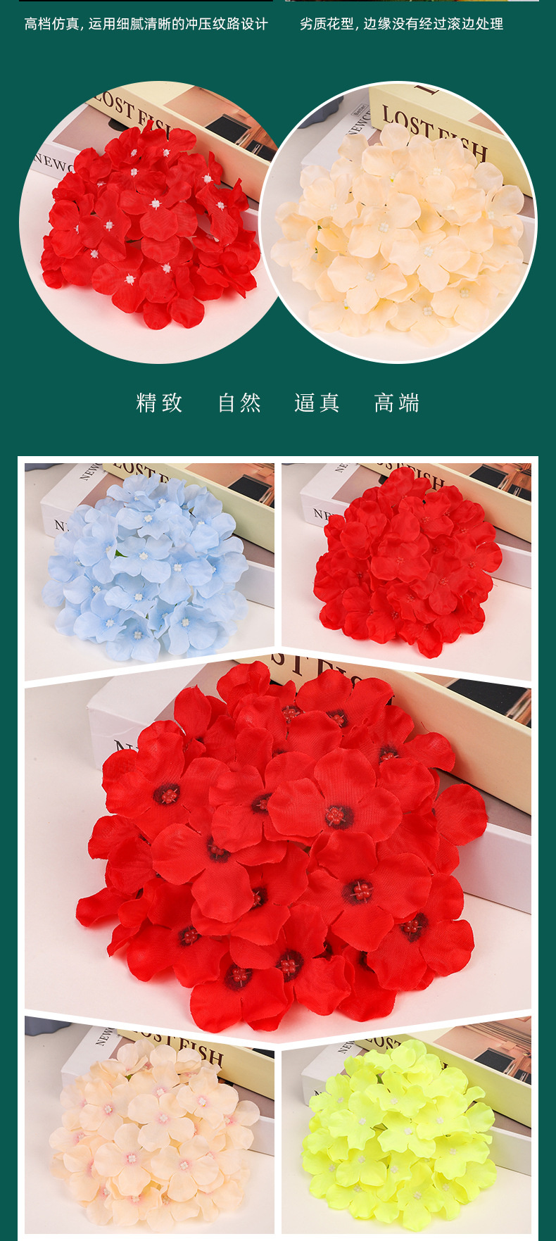 アジサイの花頭、結婚式用の花、シーン装飾、造花、シルクフラワー、花頭、花壁装飾、造花、偽花、越境