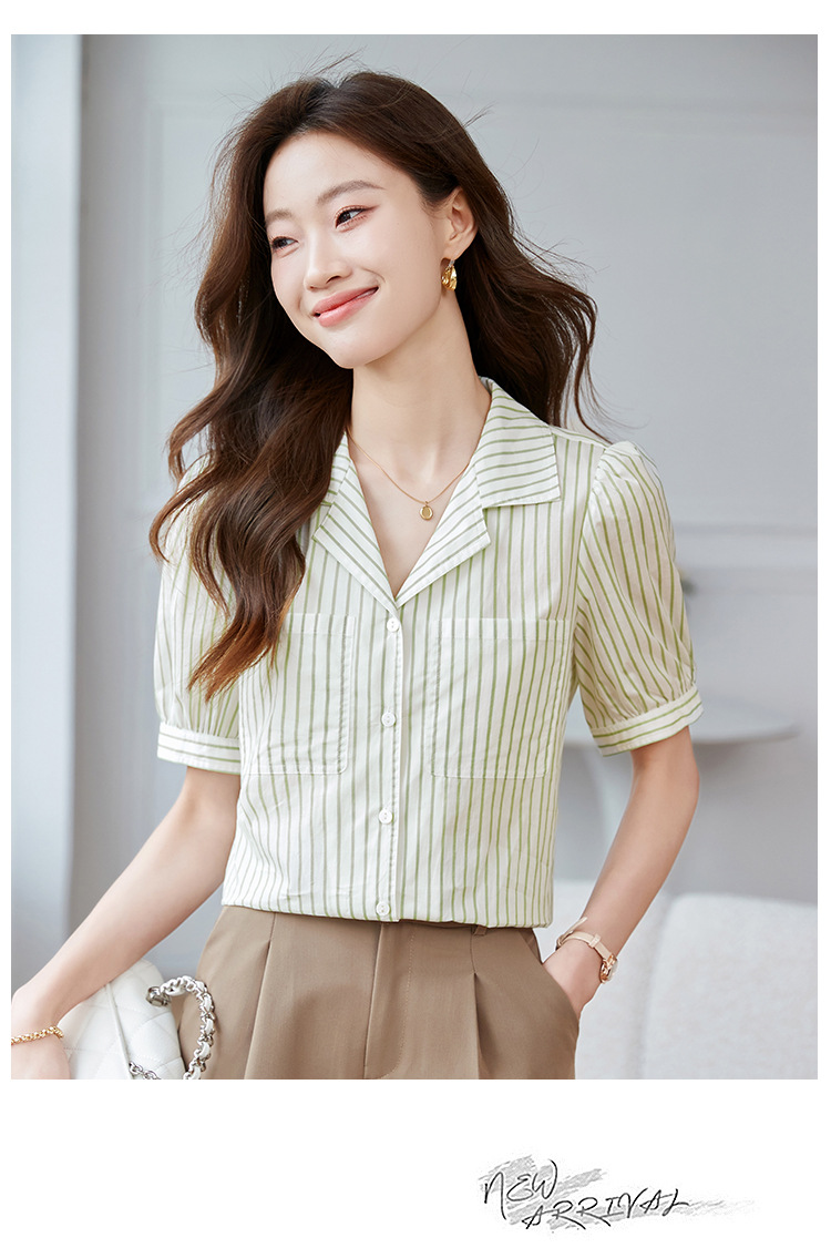 ストライプのシャツの女性のスーツの襟のシンプルな質感は袋のデザイン感を貼ります。