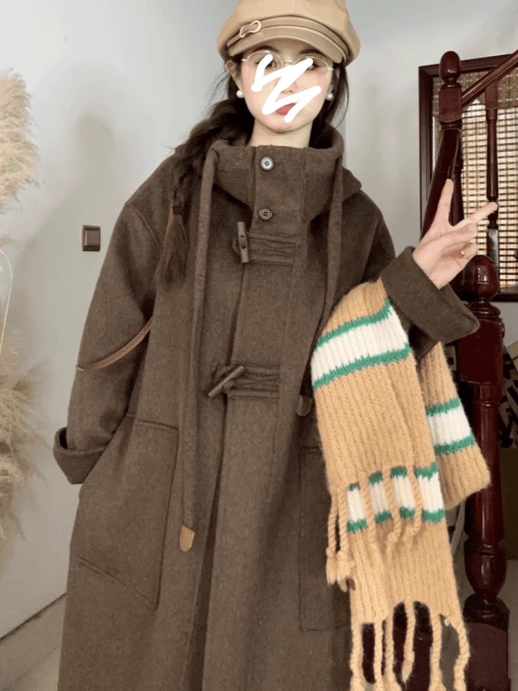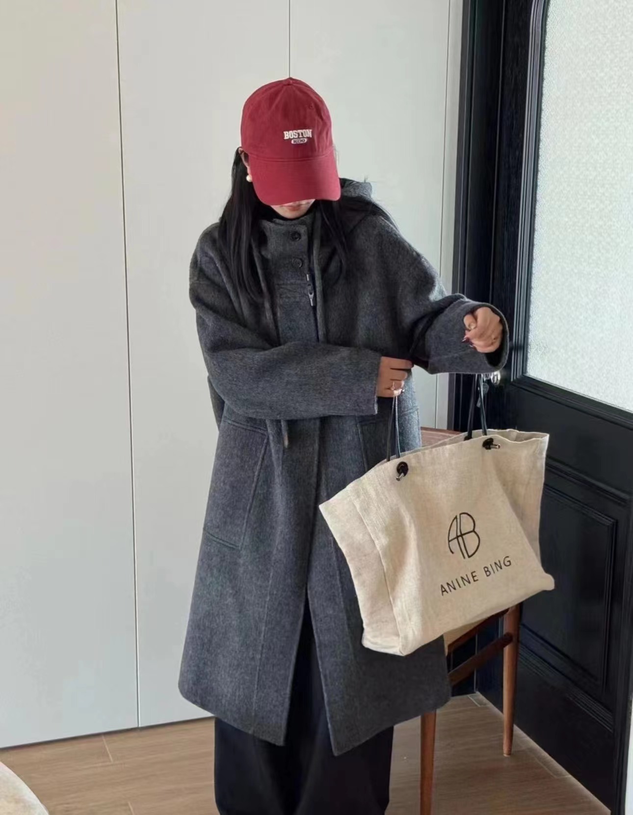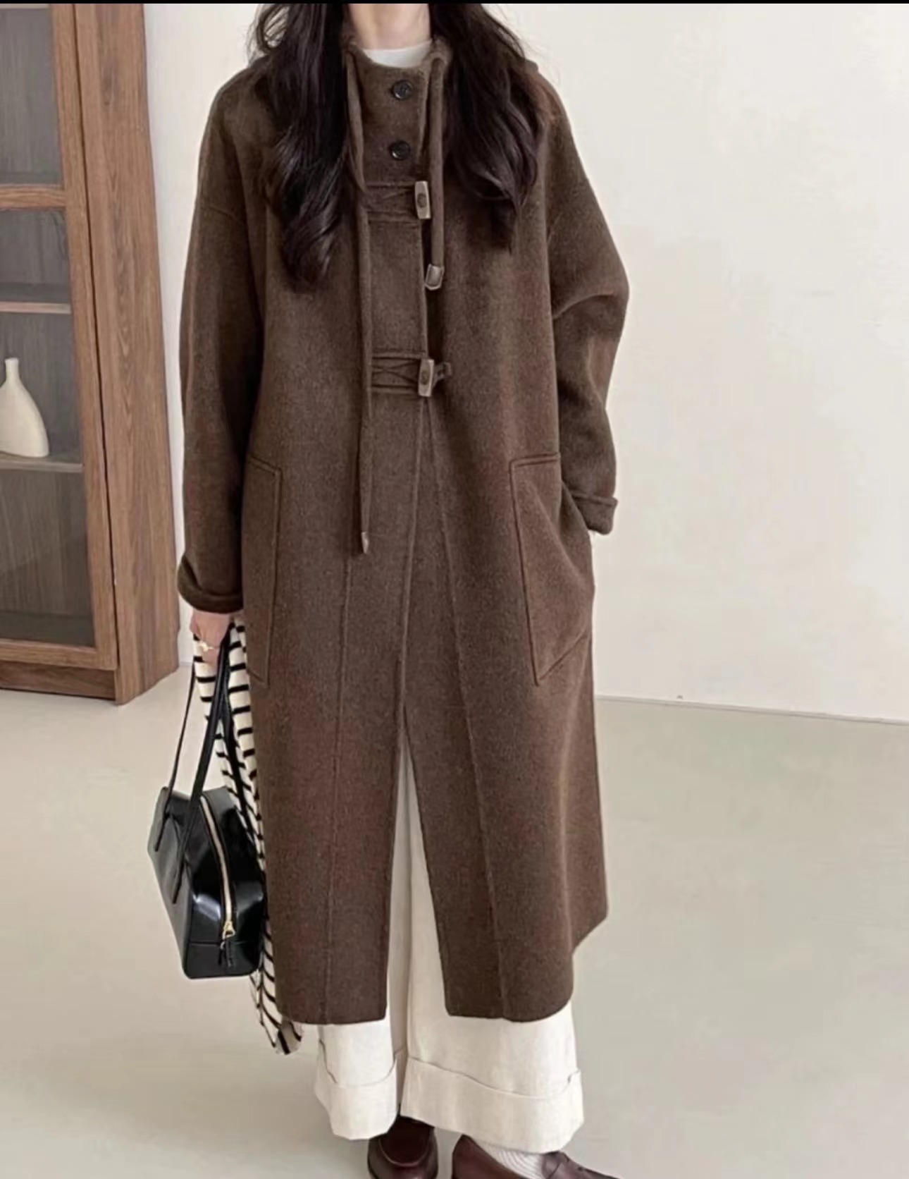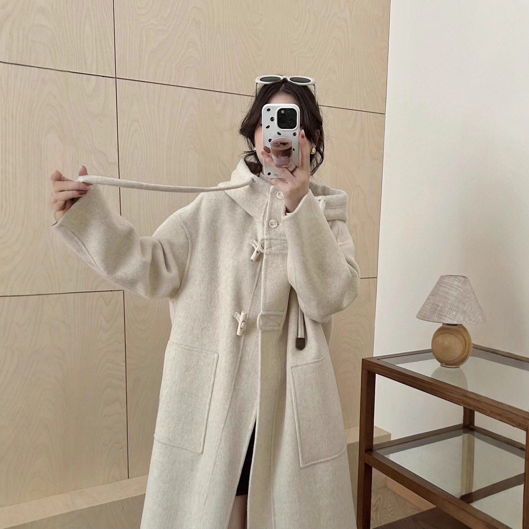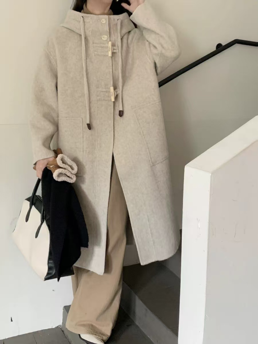 ソウルアカデミー2025秋冬韓国風フード付きホーンボタンワイドバージョンハイエンド増厚拡張両面ウールコート