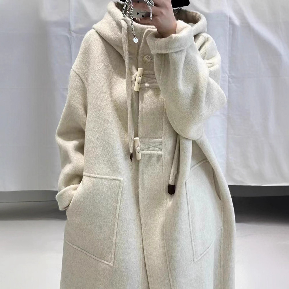 韓国のハイエンドフード付きロング2025新しい両面ウールコート女性用ホーンボタン肥厚ウールコート