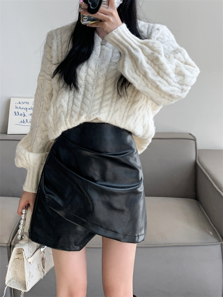 大きいサイズの太った妹の黒いしわの高い腰のa字のスカートの秋冬の新型のヒップのスカートの不規則なpu皮のスカートの女性