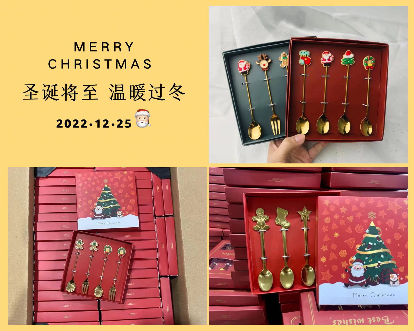 跨境圣诞餐具套装创意卡通圣诞老人节日勺叉礼盒套装不锈钢甜品勺