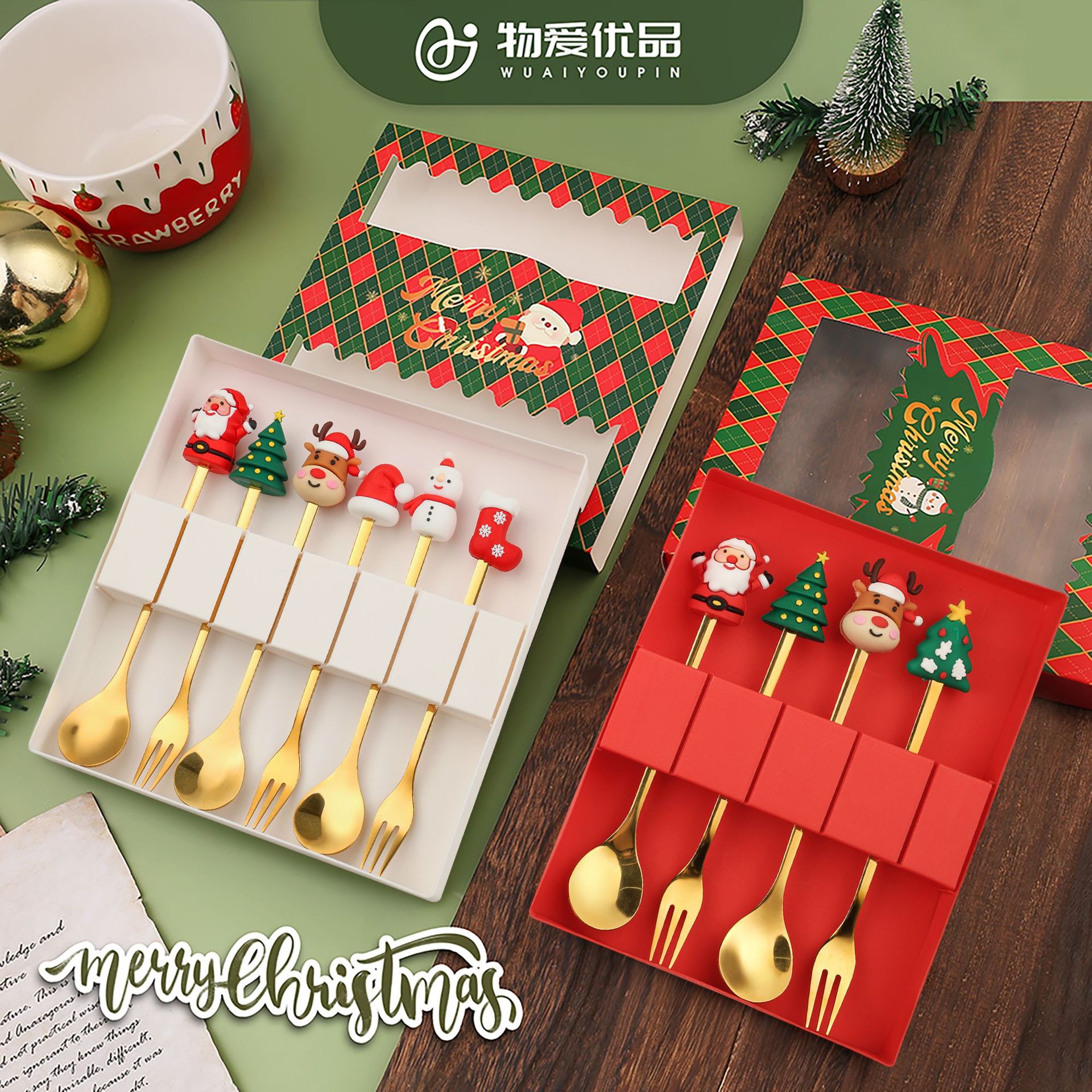 ステンレス鋼クリスマススプーンフォークギフトセットクリエイティブクリスマス要素デザートスプーンフルーツフォークコーヒー攪拌スプーン
