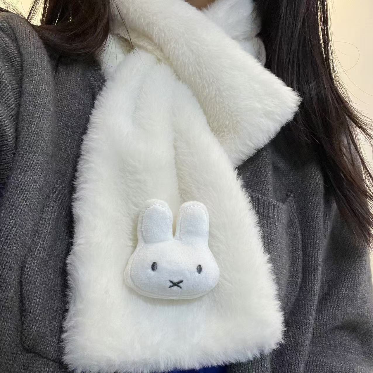 新款日系ins兔子毛绒围巾卡通保暖米菲可爱短款百搭围脖冬季交叉