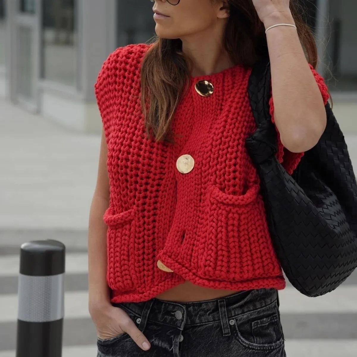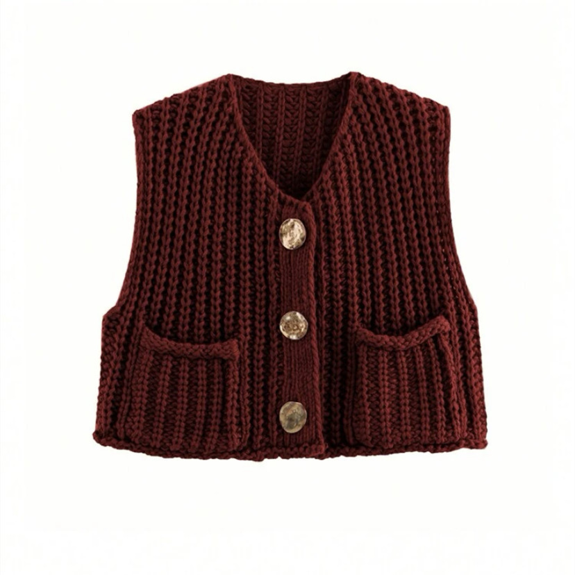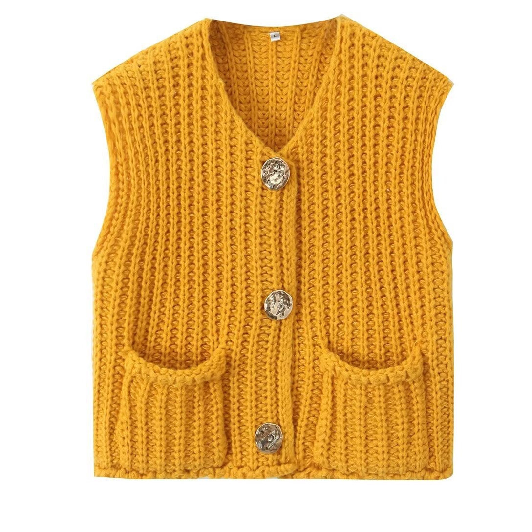 ヨーロッパとアメリカのクロスボーダーセーター卸売、Amazonのパッチポケット付きゴールドボタン、厚手ニットショートレディースカーディガン、ベスト、タンクトップ