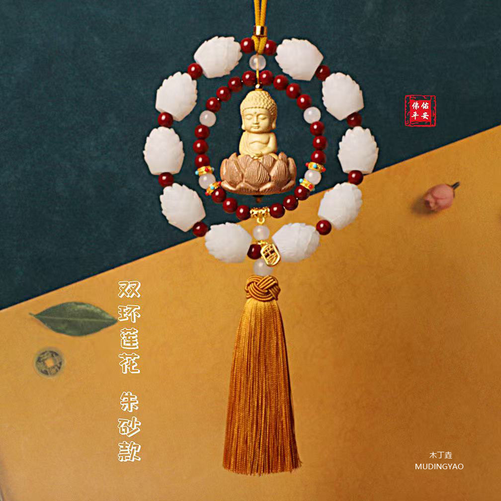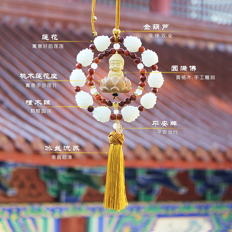 工厂直供黄杨木小佛后视镜车内挂饰挂件双环桃木莲花车载汽车装饰